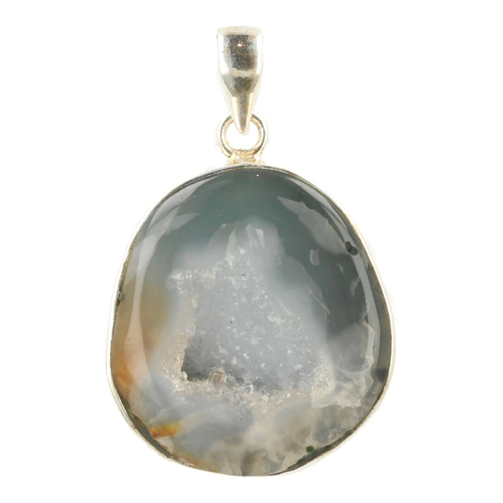 Mooie halve agaat geode hanger met zilveren oogje. Iedere hanger is uniek in tekening en kleurstelling, we zoeken de meest optimale uit bij je bestelling. Je ontvangt een soortgelijke hanger als op de foto. Deze agaat geode, oftewel holle steen is gehalveerd en de randen zijn gepolijst. Je ontvangt deze agaat geode doorboorde hanger zonder koord en kunt hem fraai dragen aan een zilveren ketting.