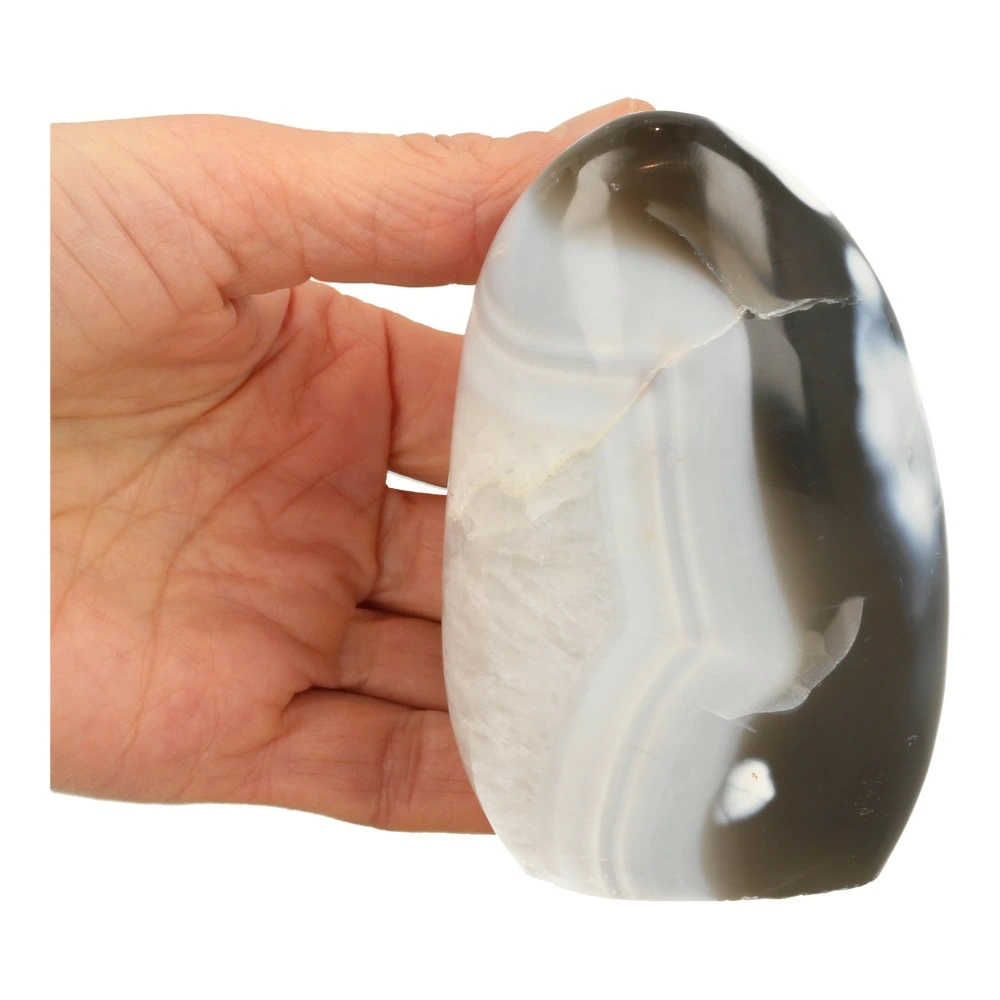 Mooie grijs-witte agaat vrije vorm met een hoogte van 98mm, een breedte van 64mm en en dikte van 43mm. Deze agaat vrije vorm heeft een fraai spel van kleuren en een bijzondere tekening door de bergkristal die in de holte is gegroeid. Een leuke gepolijste agaat, fijn om zachtjes zijn energie door de ruimte te verspreiden. Je ontvangt deze gepolijste agaat van de foto.