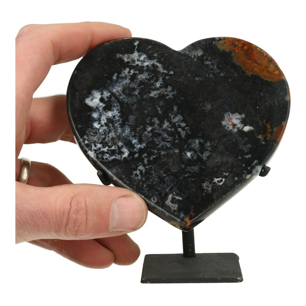 Fraai agaat hart op standaard van metaal. De afmeting van dit uniek getekende agaat hart is ongeveer 11cm breed, 10,5cm hoog en 1cm dik. De totale hoogte van dit agaat hart op standaard, inclusief standaard, is ongeveer 11,5cm. Een fraai stuk agaat om te shinen in jouw ruimte! Je ontvangt het agaat hart op standaard van de foto.