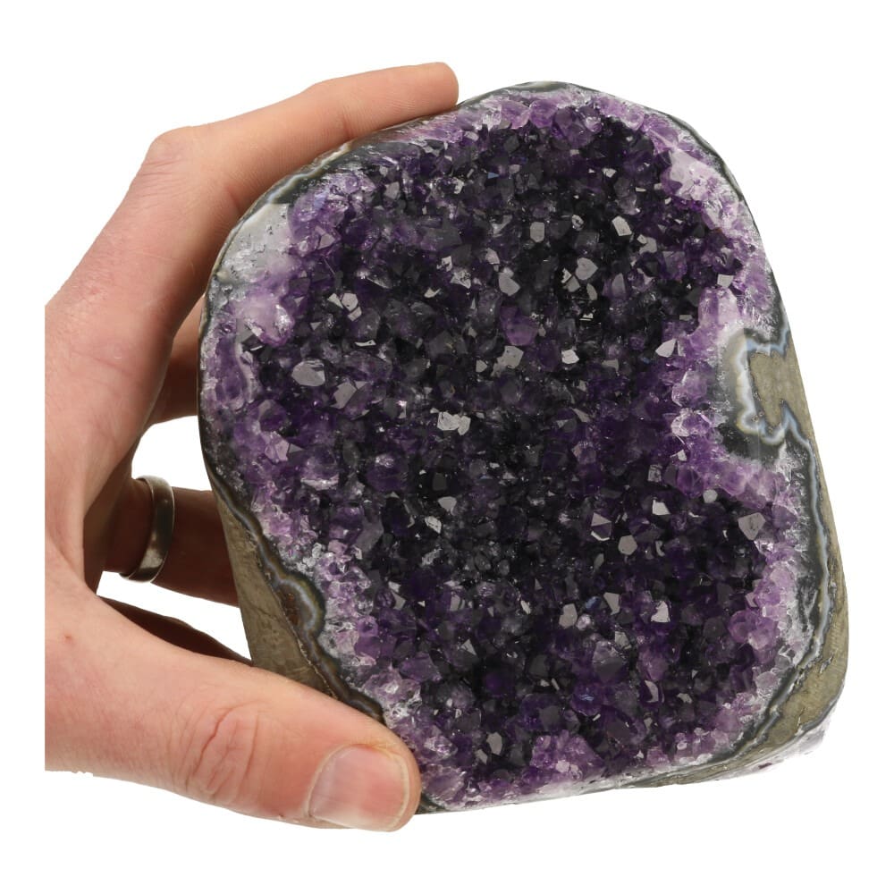 Deze donkerpaarse amethist uit Uruguay heeft een fraai gepolijste zijden. De afmeting van deze amethist zuil is ongeveer 11 cm breed, 13,5 cm hoog en 8,5 cm dik. We hebben meerdere van dit soort stukken op voorraad, dus zoek je net iets anders, neem dan contact met ons op.