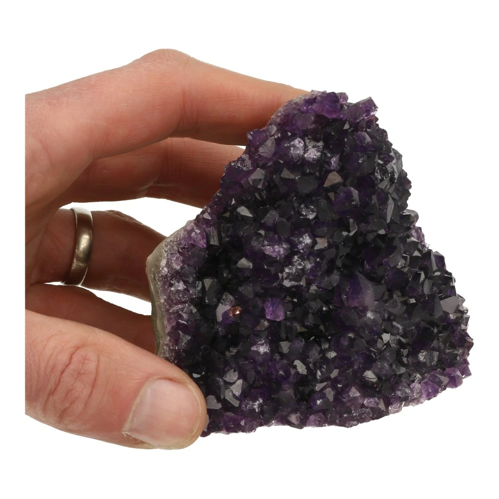 Amethist is een paarse edelsteen. De kleur varieert van lichtpaars tot dieppaars. Deze fijne en dieppaarse amethist uit Brazilië heeft mooie fijne kristallen en weinig ‘moedergesteente’. Een heldere aanwezigheid die je uitnodigt je bewustzijn te verruimen en in zachtheid op aarde te zijn. De afmeting is ongeveer 10,5 cm breed aan de basis, 8cm hoog en 6cm diep. Je ontvangt de fraaie amethist van de foto.