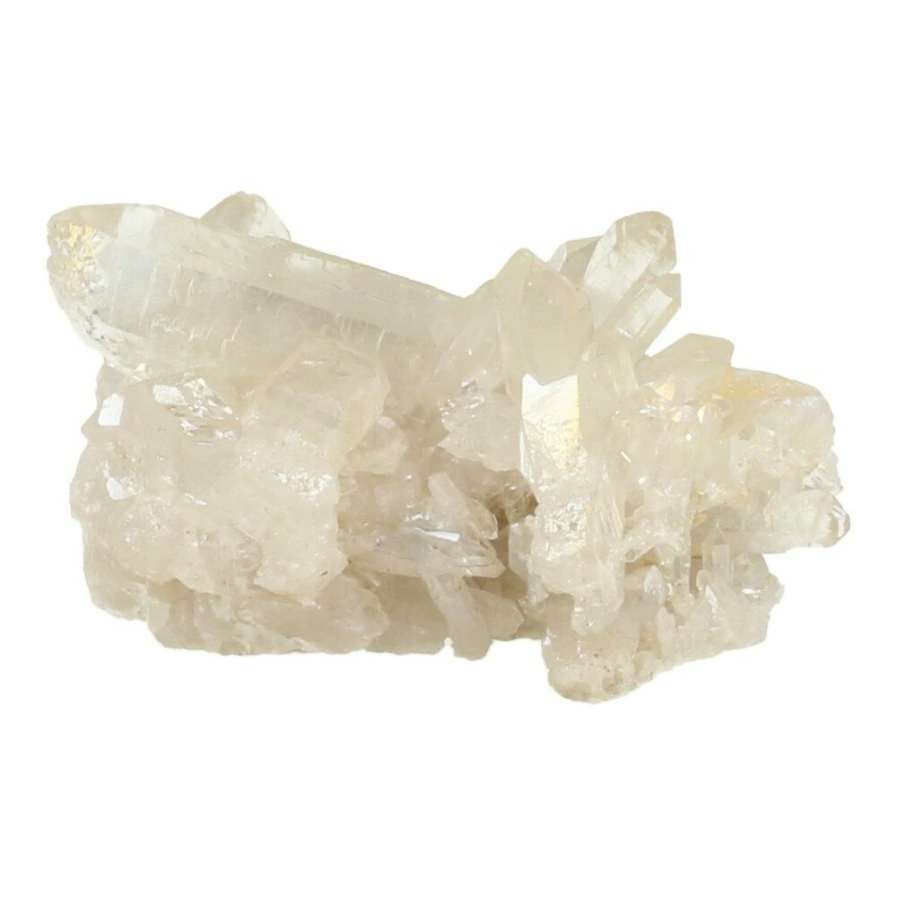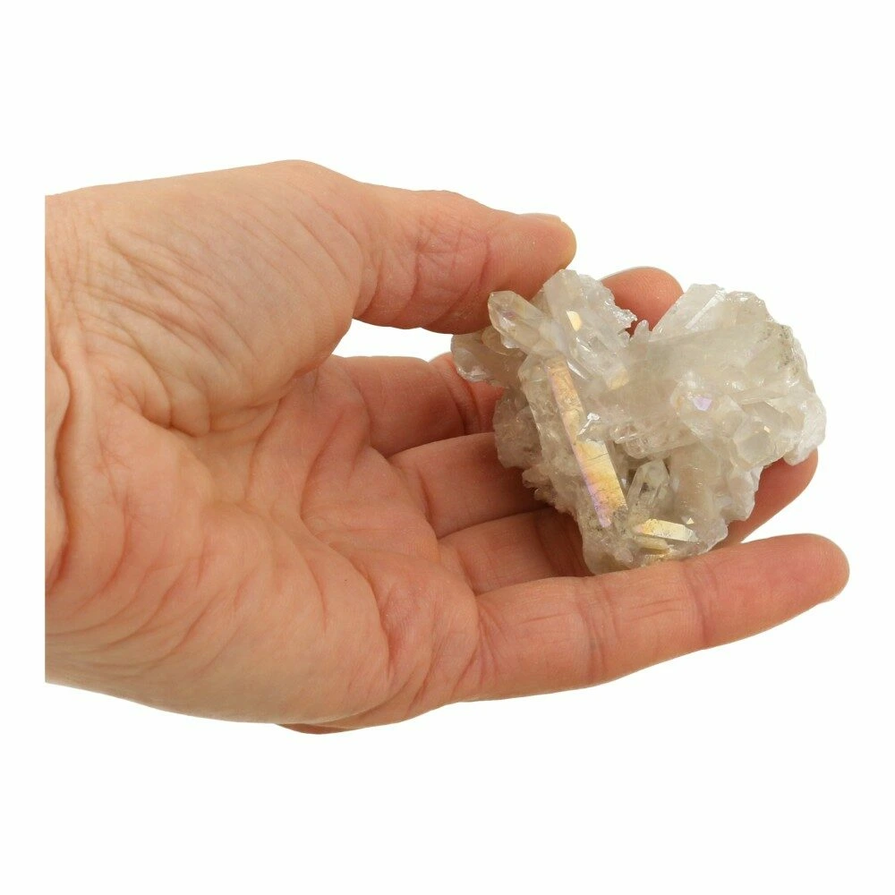 Fraai cluster angel aura ‘nr4’. Angel aura is bergkristal gecoat met zilver en platina, waardoor er een fraaie wit-olieachtige glans ontstaat. Deze in het lab gemaakte laag combineert de kwaliteiten van bergkristal met die van zilver en platina. Hieronder is de werking van bergkristal te lezen, de engelachtige glans maakt het voorkomen van dit stuk angel aura zacht en liefdevol. De afmeting is ongeveer 3cm hoog, en een basis van 4,5 x 4cm. Je ontvangt het cluster angel aura van de foto.
