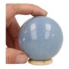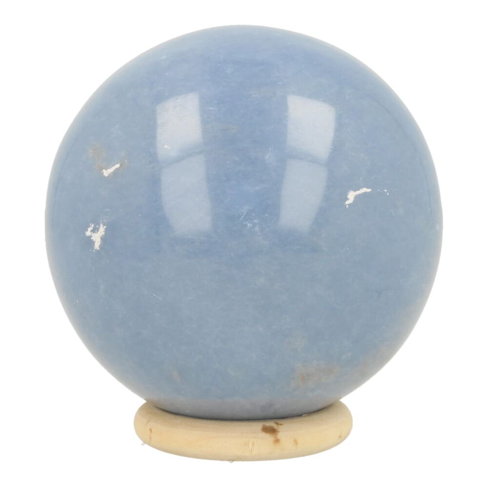Fijne licht blauwe angeliet bol met een diameter van 71mm en houten ring uit Peru. Je ontvangt de angeliet bol van de foto.