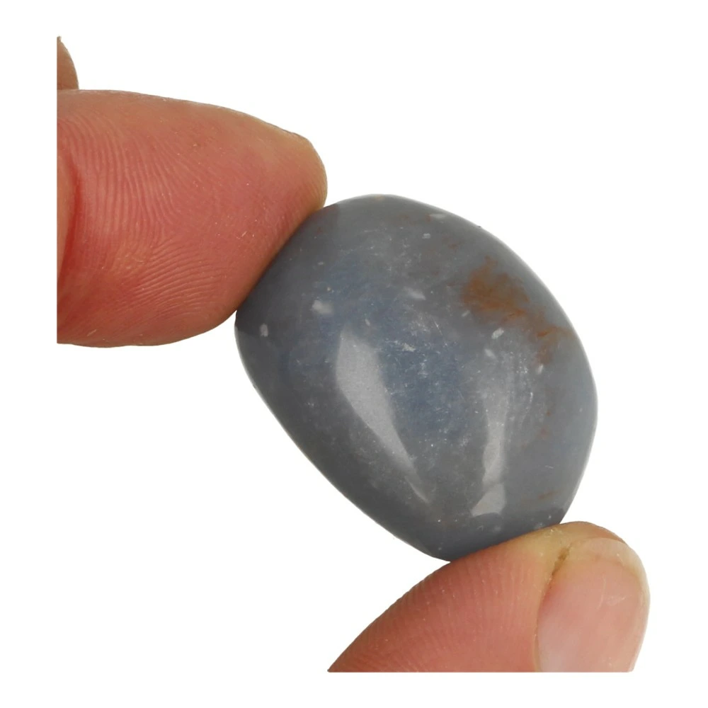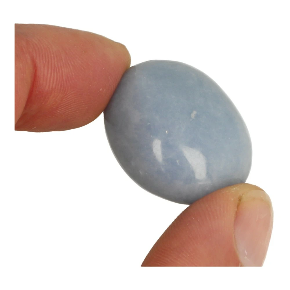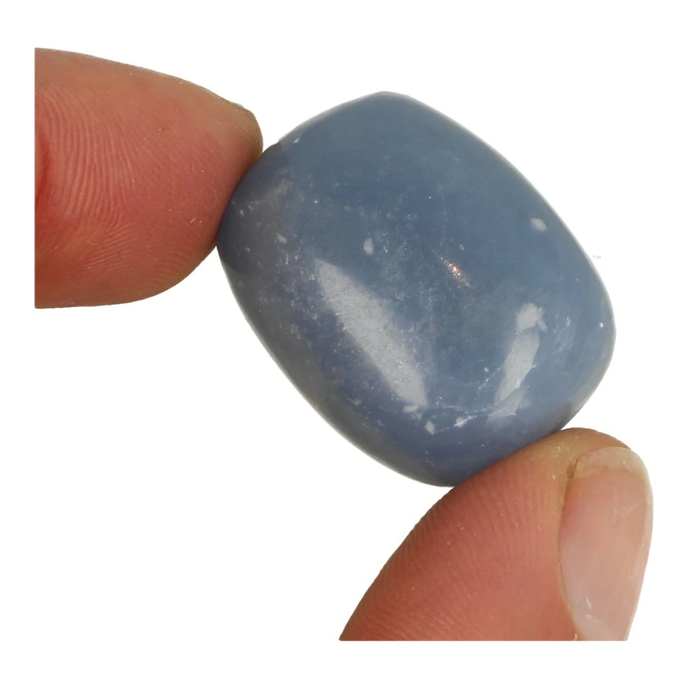 Fijne licht- en donkerblauwe angeliet trommelsteen van circa 3cm lang. Je ontvangt een soortgelijke angeliet trommelsteen als op de foto. Zoals op de foto’s te zien is, kan de kleur en vorm iets wisselen onderling. Een trommelsteen is een glad gepolijste steen, welke door een trommelmachine glad is gemaakt.
