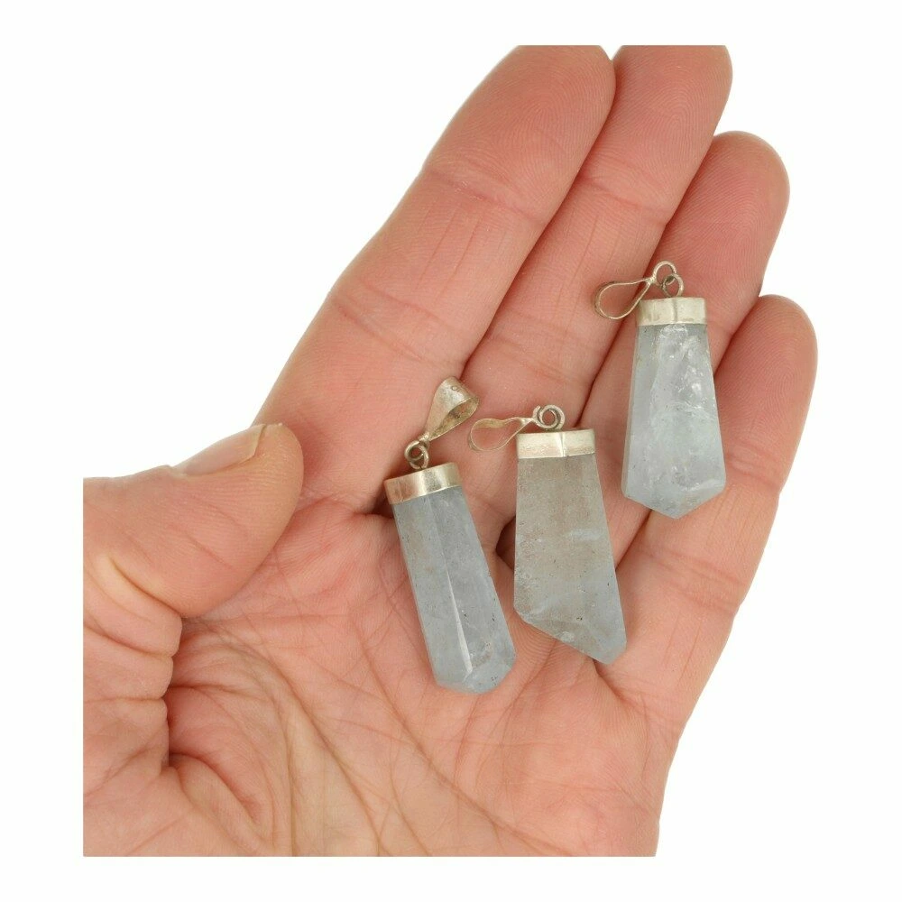 Prachtige kwaliteit helder blauwe aquamarijn hanger met zilveren kapje in geslepen punt van ongeveer 3cm lang. De hanger is een gepolijst aquamarijnkristal welke in zilver is gevat. Hierdoor is iedere hanger anders in formaat. Je ontvangt deze hanger zonder ketting of koord en kunt deze prachtig dragen aan een zilveren ketting. De afmetingen variëren en zijn ongeveer 0,8-1,3 cm breed en 2,7-3,5 cm hoog. Wil je weten welke je ontvangt? Laat het even weten bij je bestelling en we sturen je van tevoren een foto.