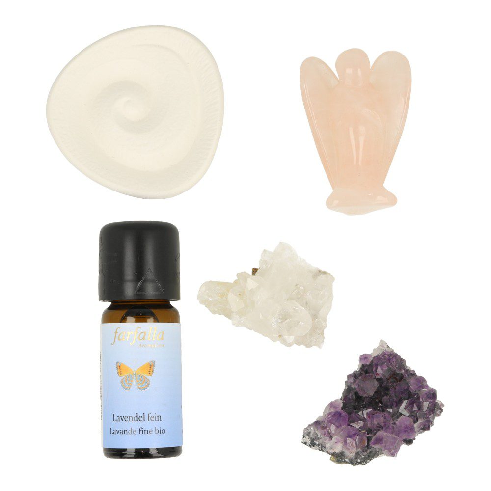 Heerlijke balans en harmonie cadeauset, voor ontspanning, balans en een gevoel van harmonie. De balans en harmonie cadeauset bestaat uit lavendelolie, een geursteen en een gouden driehoek met rozenkwarts engel