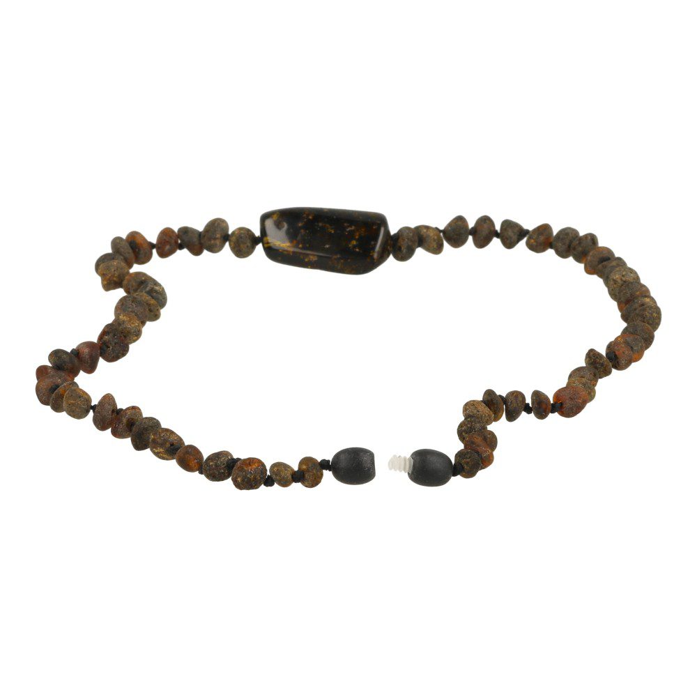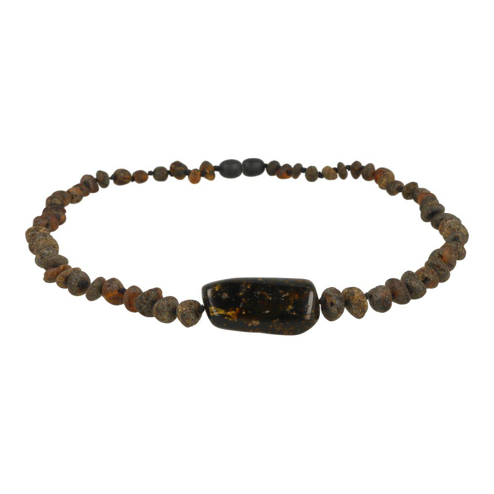 Mooie barnsteen ketting van ruwe bruine barnsteen stukjes en een lengte van 45cm. In het centrum van de ketting is een grote gepolijste bruine barnsteen geplaatst van ongeveer 3cm lengte. Deze barnsteen ketting sluit met een draaisluiting. Je ontvangt een soortgelijke barnsteen ketting als op de foto. De ketting is geregen aan niet-rekbaar koord met barnsteen uit Litouwen. Gave stoere ketting!