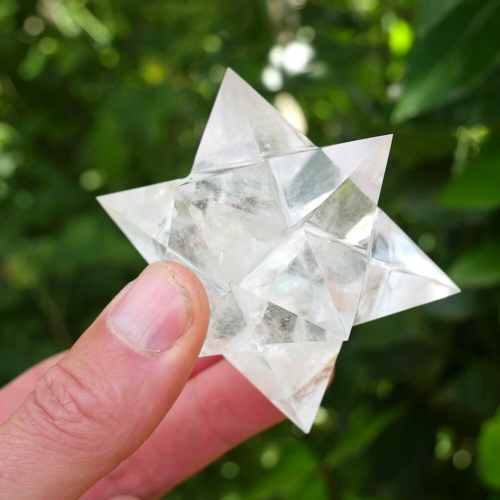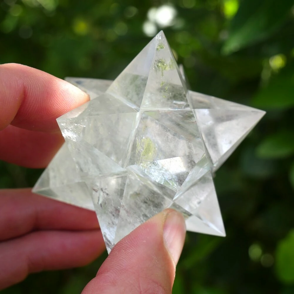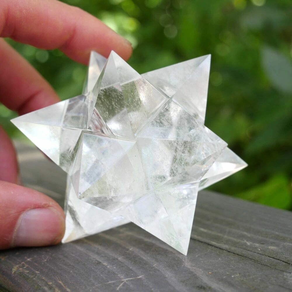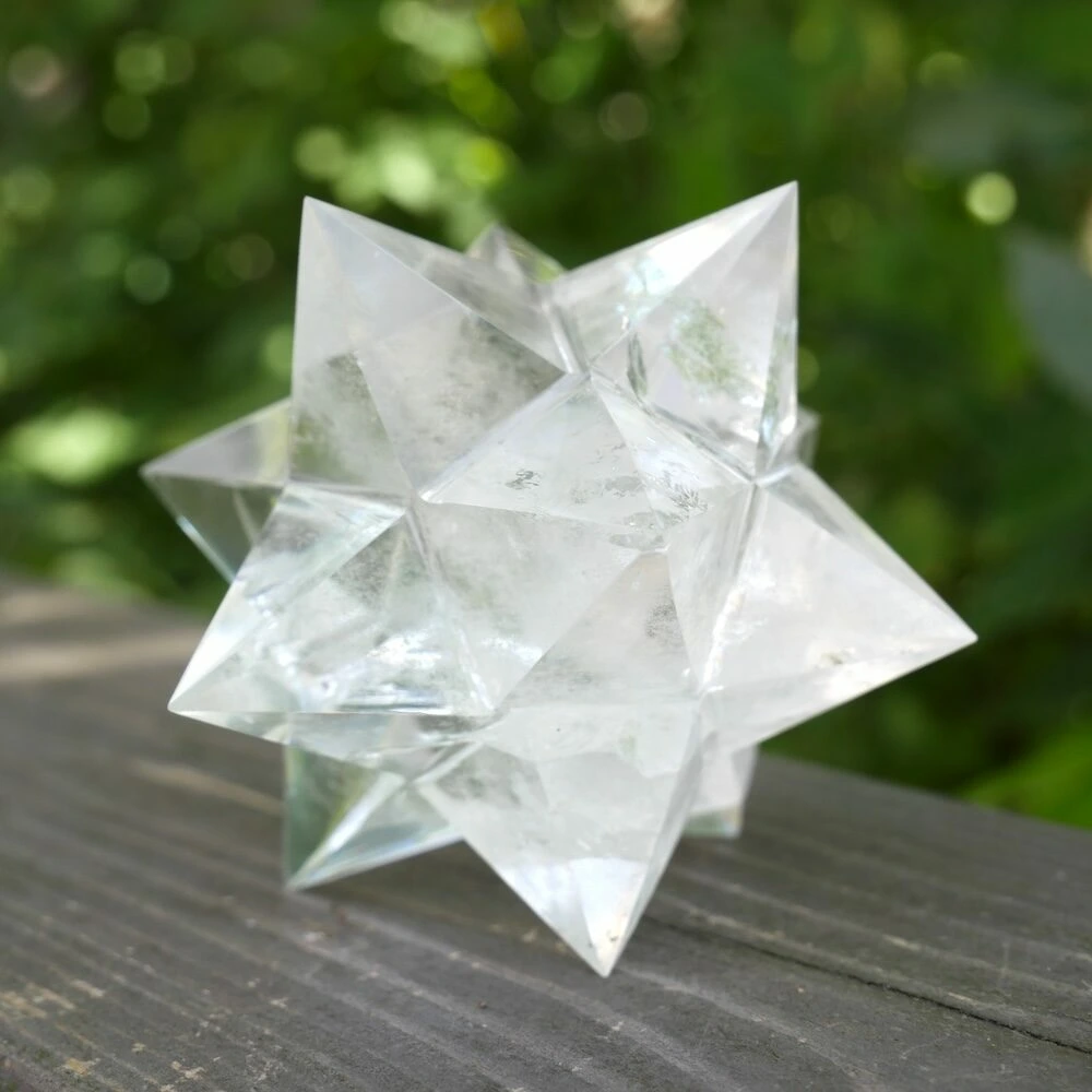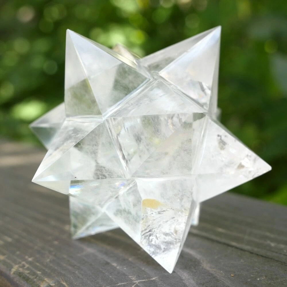 Heldere bergkristal dodecaëder ster met een punt-tot-punt afstand van ruim 8,5cm. De kwaliteit van heldere bergkristal wordt gecombineerd met de geometrische dodecaëder ster vorm. Deze bergkristal zit vol fraaie regenboogjes als de zon er in schijnt.