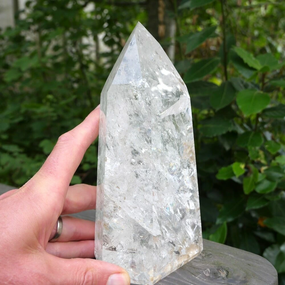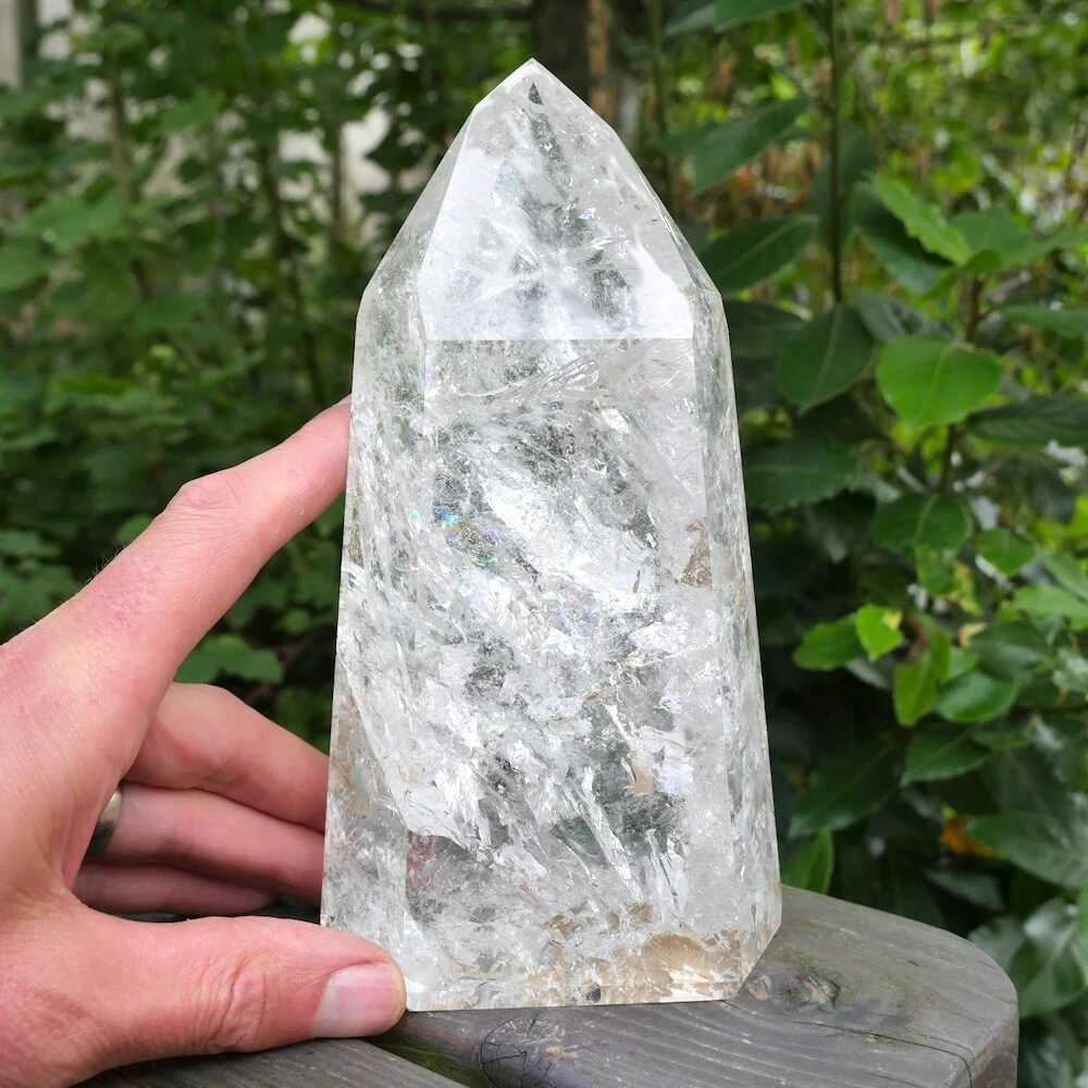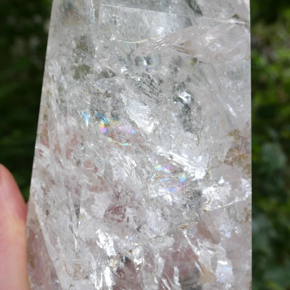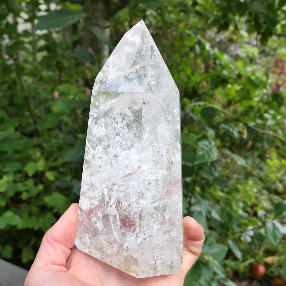 Fraai gepolijste bergkristal punt XL, vol met regenbogen uit Brazilië. Dit heldere stuk met sterke energie straalt je tegemoet. Heerlijk om jouw ruimte te verlichten en mooi als decoratie. De afmetingen zijn ongeveer 20cm hoog, 10,5cm breed en 7 cm diep. Een stralend middelpunt voor jouw ruimte om helderheid en licht te brengen. Je kunt ook fijn met deze punt mediteren voor meer diepgang en connectie met het universum. Je ontvangt uiteraard de punt van de foto.