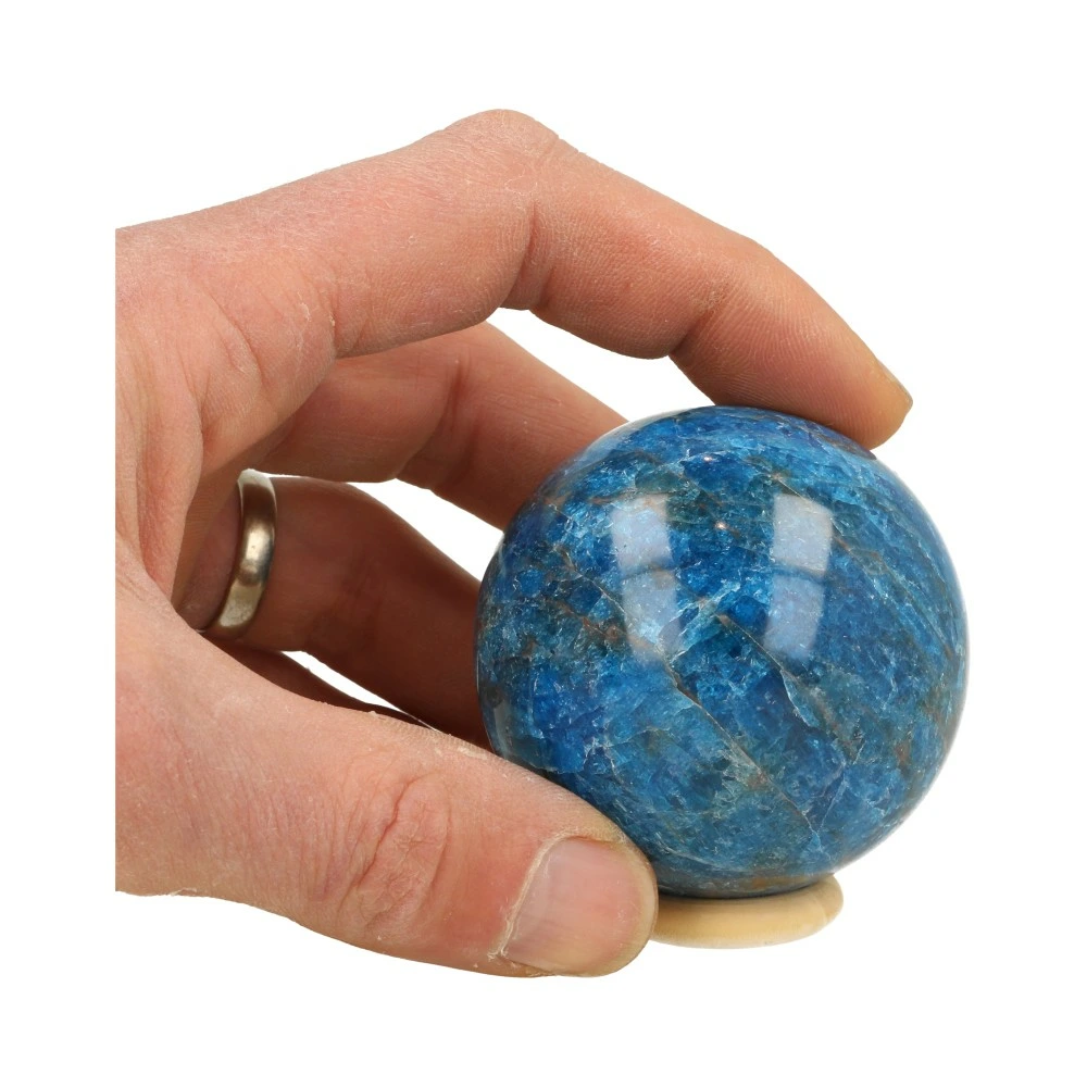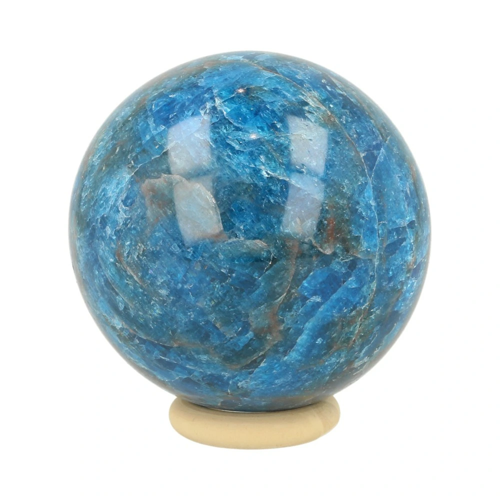 Prachtige A-kwaliteit helderblauwe apatiet bol met een diameter van 59mm op een houten ring. Deze blauwe apatiet bol is helder van kleur en heeft een fraaie schittering onder het juiste licht. Dit zie je op de foto niet, dus die bol is in het echt nog veel mooier. Je ontvangt de blauwe apatiet bol van de foto, inclusief houten ring.