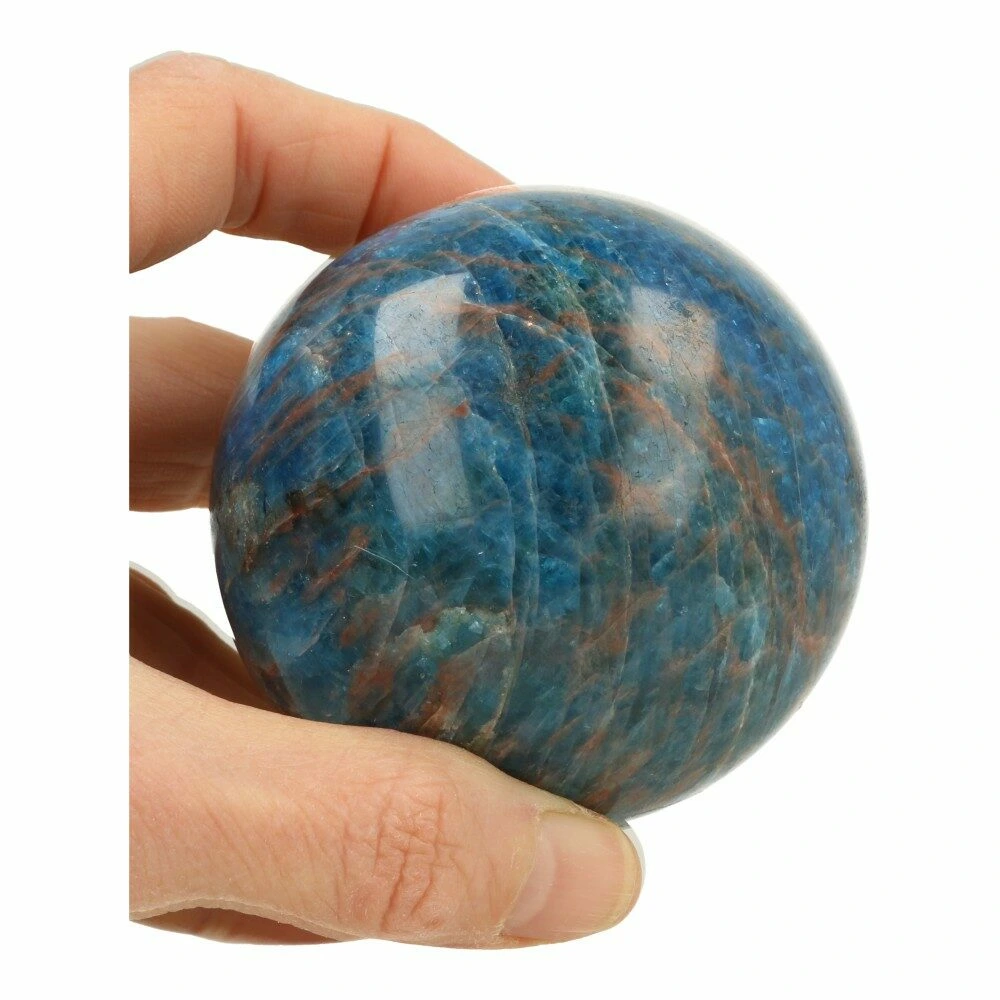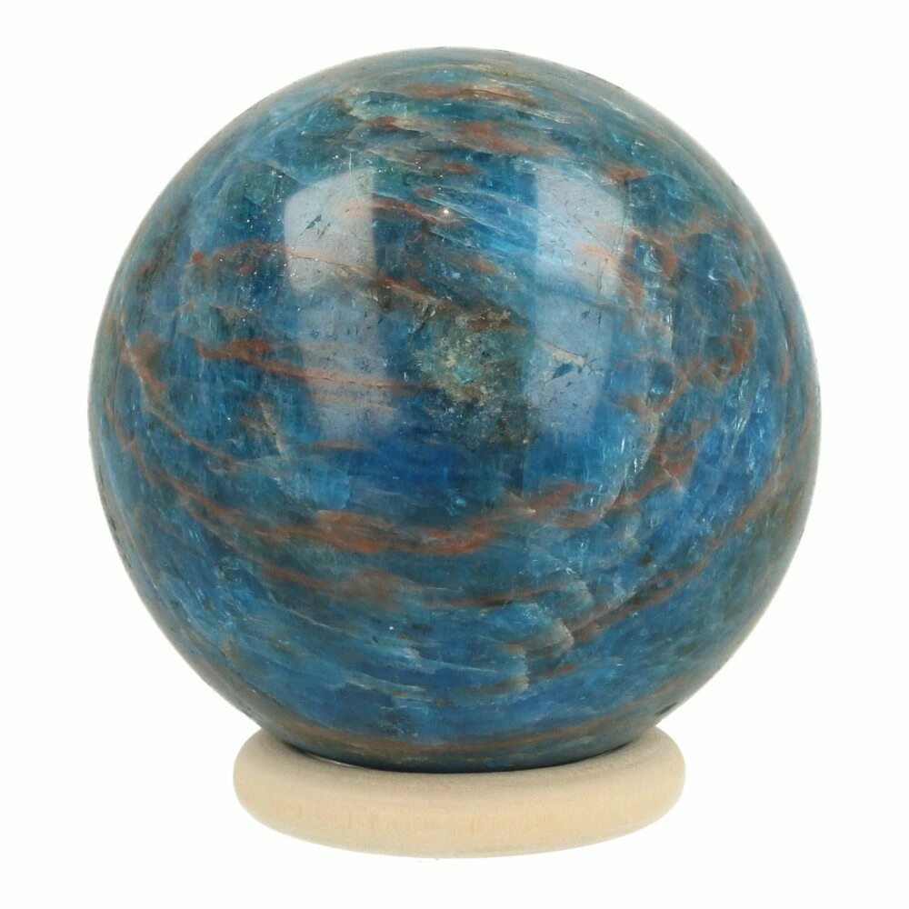 Prachtige helder blauwe apatiet bol met een diameter van 70mm op een houten ring. Deze blauwe apatiet bol is helder van kleur en heeft een fraaie schittering onder het juiste licht. Dit zie je op de foto niet, dus die bol is in het echt nog veel mooier. Je ontvangt de blauwe apatiet bol van de foto, inclusief houten ring.