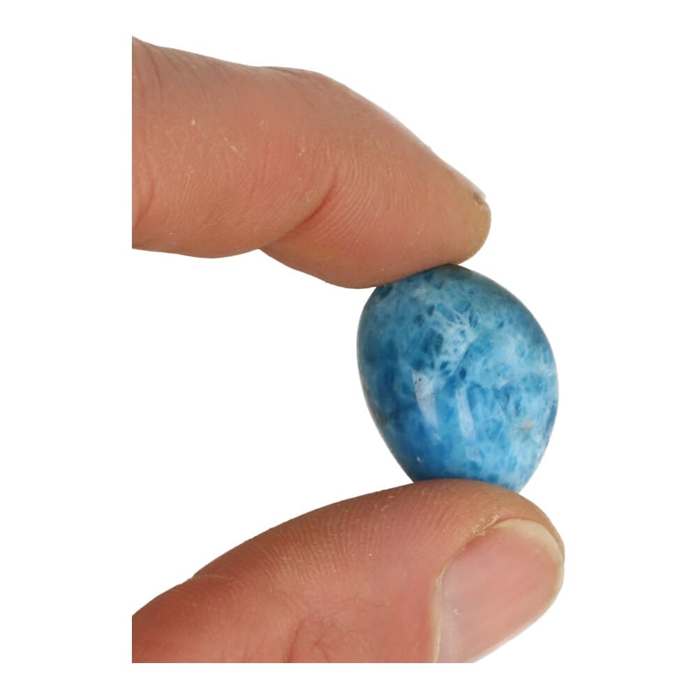 Prachtige helder blauwe apatiet trommelsteen rond van circa 2cm lengte. Heerlijk voor om bij je te dragen in je broekzak. Je ontvangt een soortgelijke blauwe apatiet trommelsteen als op de foto. De kleur en vorm varieert onderling, we doen ons best om een passende voor je te selecteren.