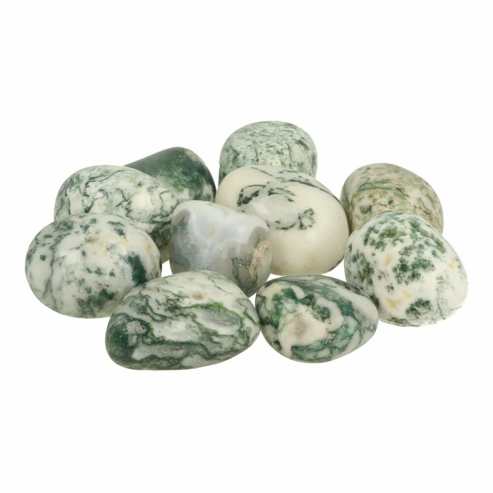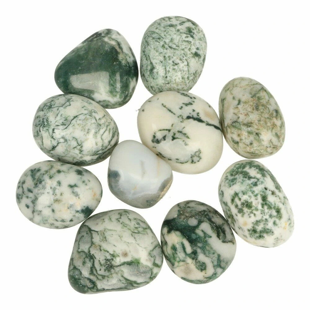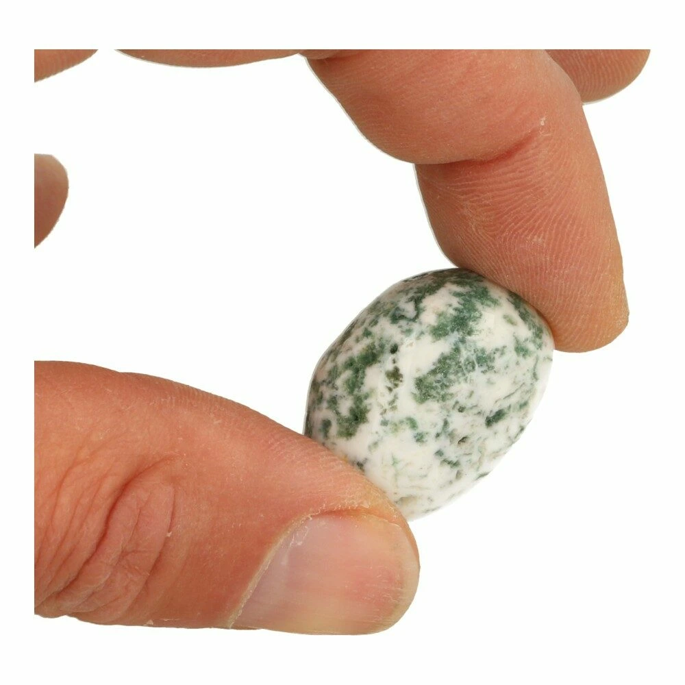 Mooie wit-grijze boomagaat trommelsteen met groene vlekken. Iedere boomagaat trommelsteen is uniek in tekening, we zoeken de meest optimale uit bij je bestelling. De afmeting van de boomagaat trommelsteen is ca 2-3cm breed en 3-4 cm lang.