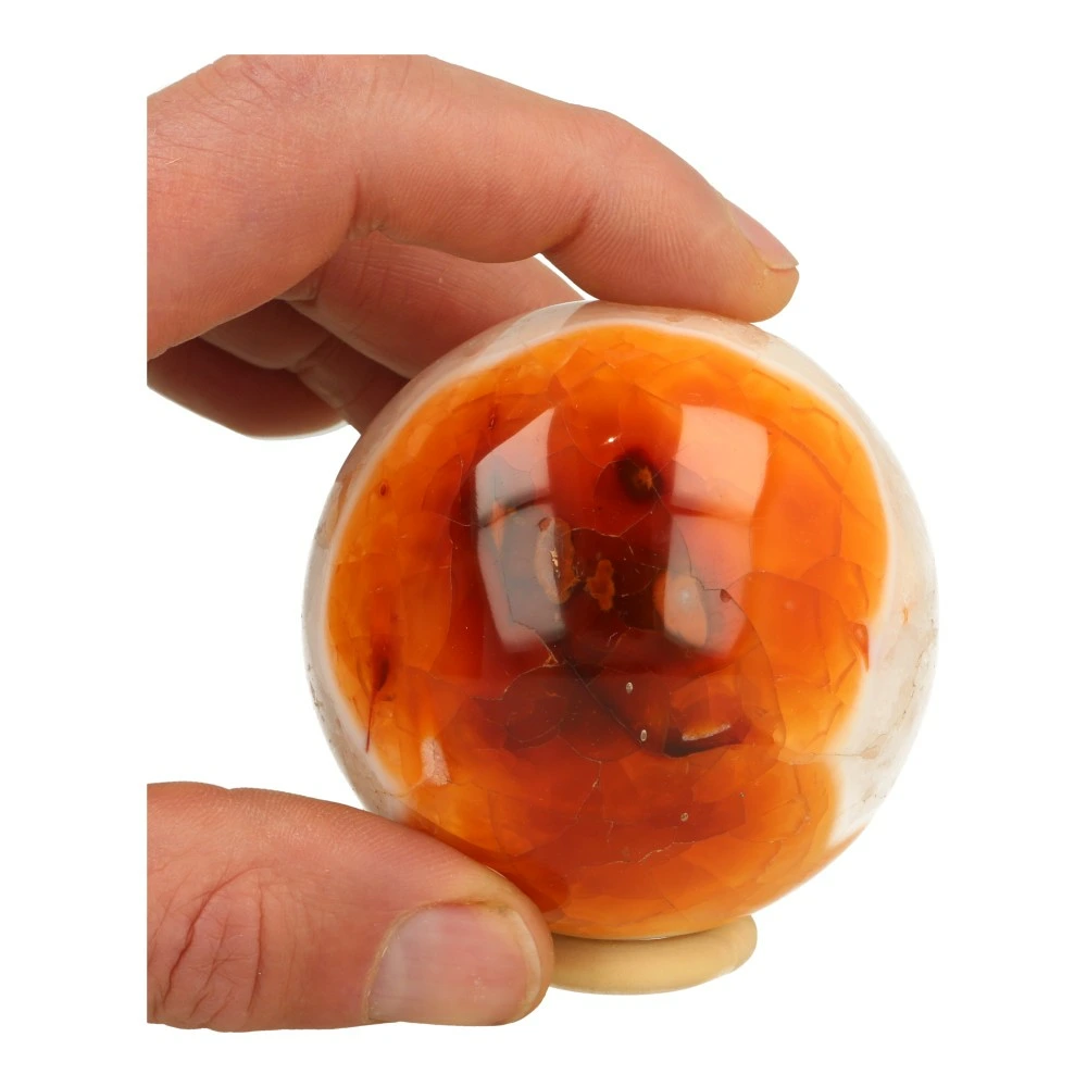 Mooie wit met rode carneool bol met een diameter van 68mm. Je ontvangt deze carneool bol met een houten ringetje. Je ontvangt de carneool bol van de foto. Deze bijzondere bol met grote baan met bergkristal gevulde holte en fraaie helderrode kleur is licht en vrolijk van energie.