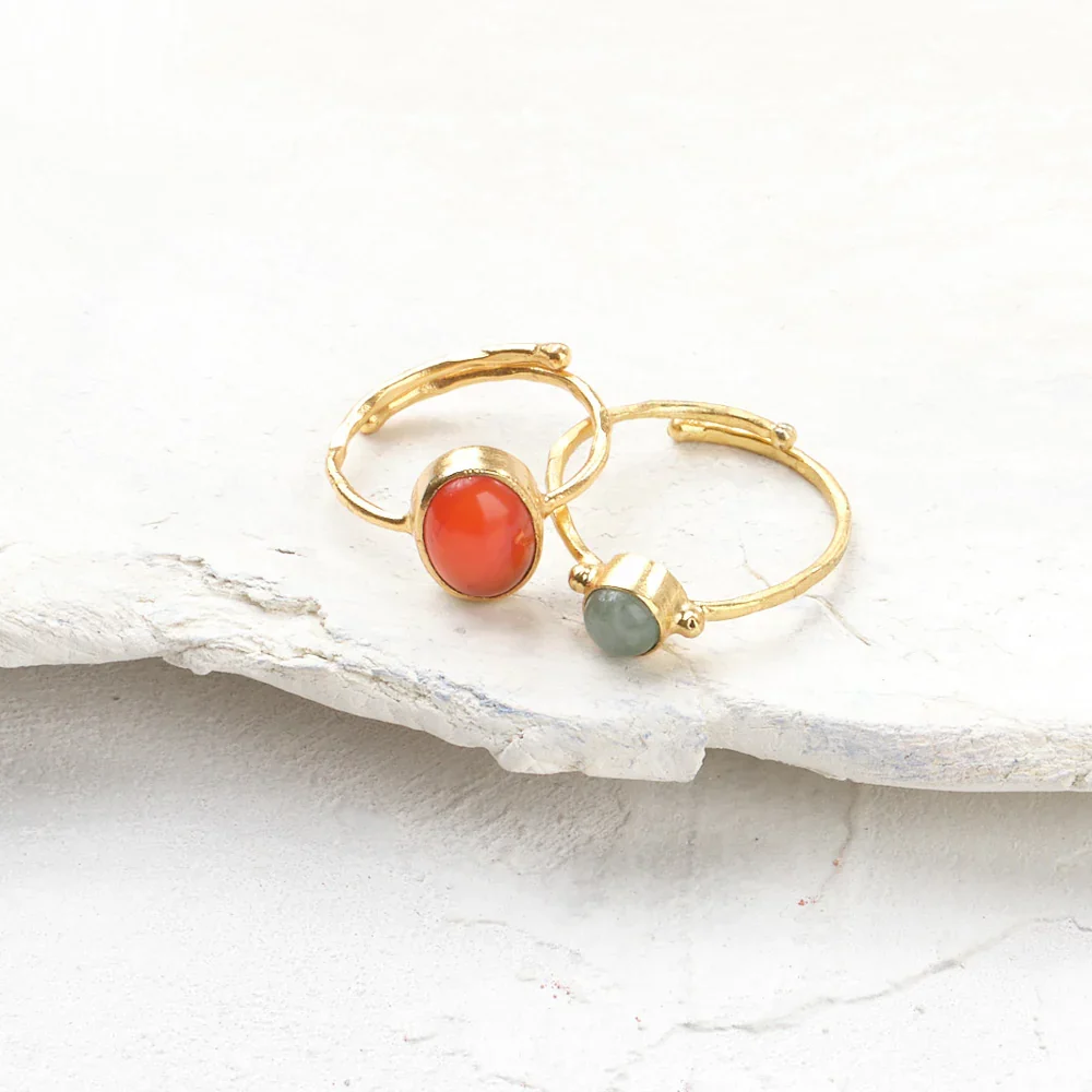 Deze Faithful Carneool Vergulde ring van A Beautiful Story. Deze mooie, handgemaakte ring is gemaakt van verguld messing en heeft een carneool edelsteen. De ring heeft een standaard binnenmaat van 16 mm en is makkelijk verstelbaar.