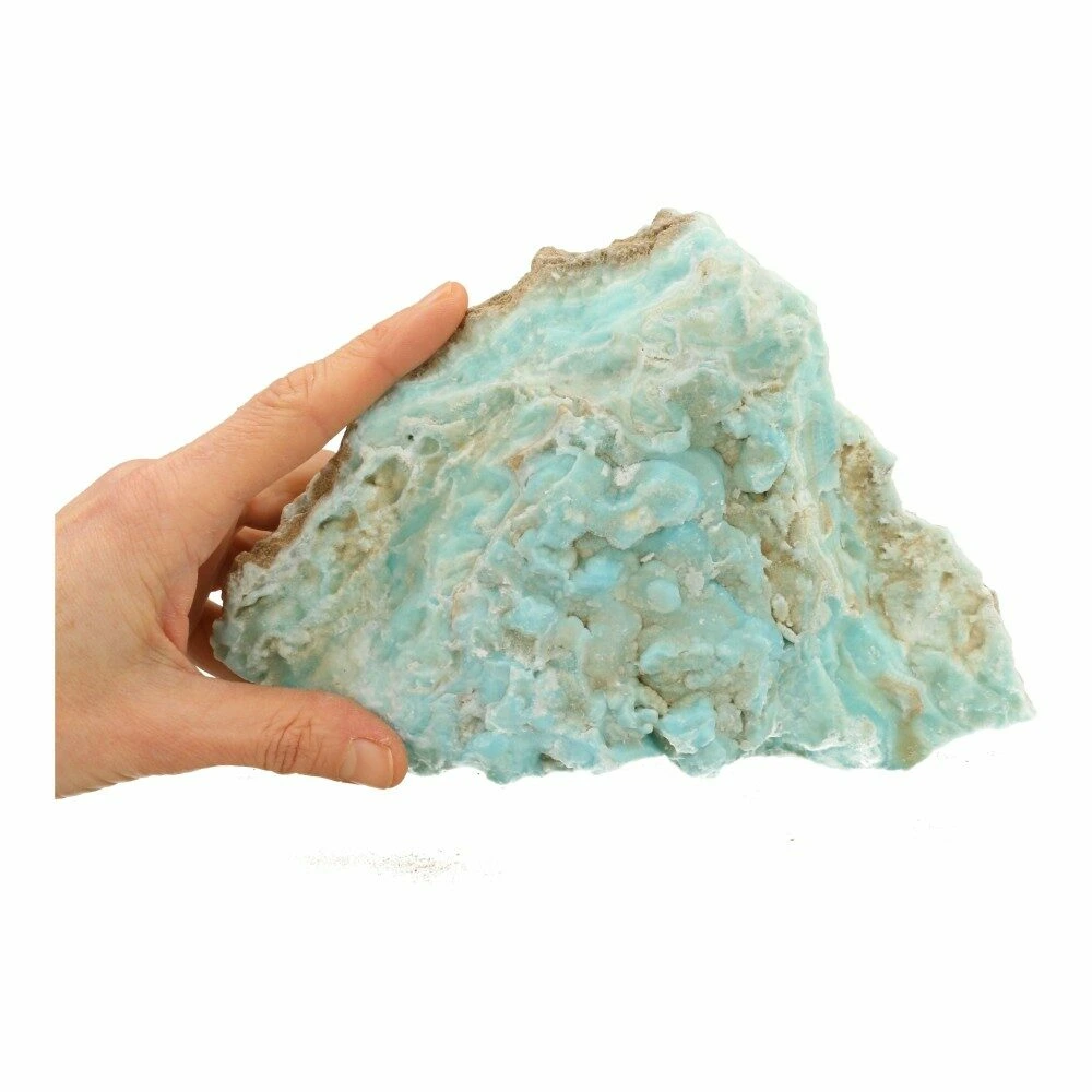 Fraaie Carribean blue calciet knuffelsteen maat groot, van ongeveer 7 – 8,5cm lang, 4-5cm breed en 2-3cm dik. Carribean blue calciet is een nieuwe vondst uit 2020 en is een fraaie variant van blauwe aragoniet. De carribean blue calciet knuffelsteen bevatten vaak natuurlijke holtes. Je ontvangt een soortgelijke carribean blue calciet knuffelsteen als op de foto.