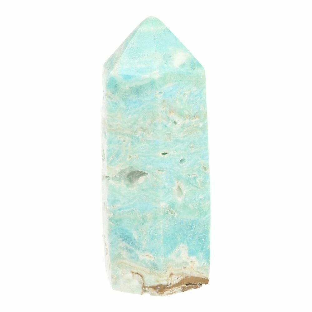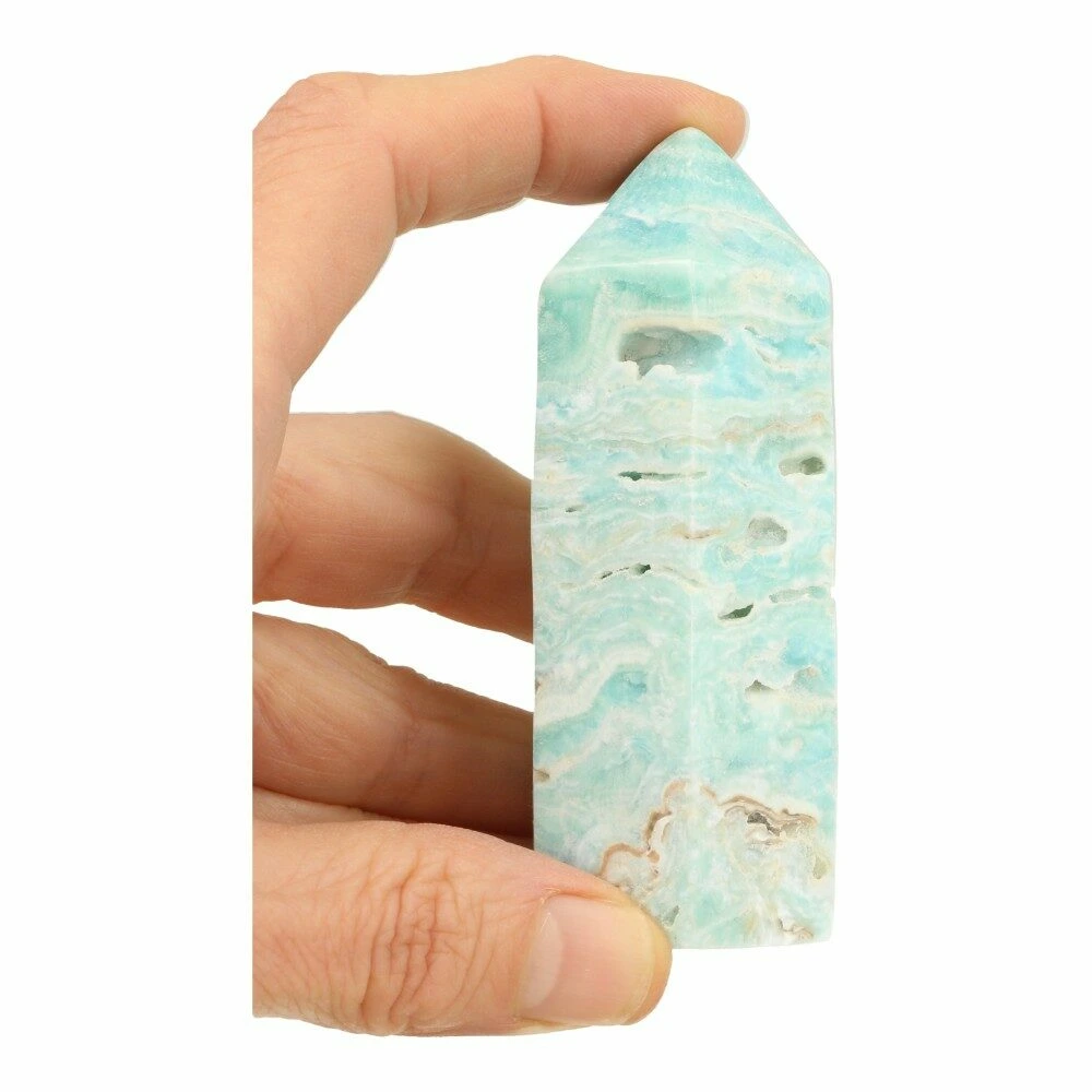 Fraaie Carribean blue calciet toren met een hoogte van 88mm en een basis van 32 x 32mm en zes hoeken. Carribean blue calciet is een nieuwe vondst uit 2020 en is een fraaie variant van blauwe aragoniet. Prachtige toren met fraaie lijnen en kleuren. Je ontvangt de toren van de foto. Deze carribean blue calciet toren heeft veel natuurlijke holtes.