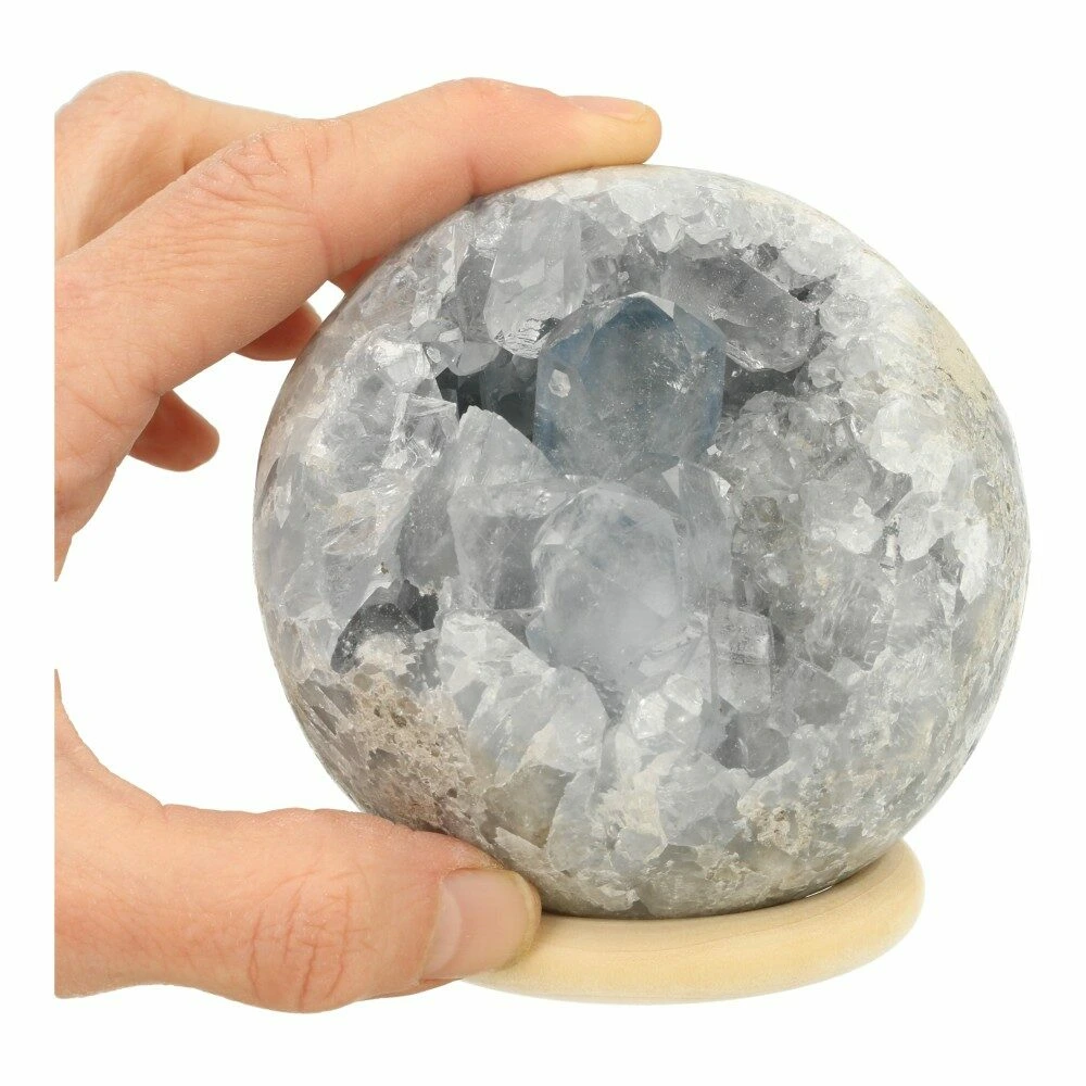 De diameter van de bol is ongeveer 9 cm, de hoogte van de onderzijde tot de ruwe bovenkant is ongeveer 8cm. Je ontvangt de celestien bol van de foto met houten ring.