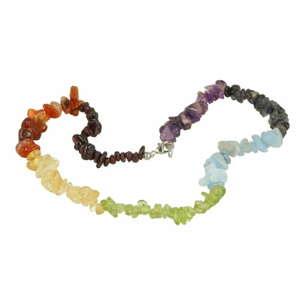 Fijne chakra ketting met de kleuren van de 7 chakra’s en sluiting. De lengte van de chakraketting is circa 45cm. Je ontvangt een soortgelijke chakra ketting als op de foto. De sluiting is van zilverkleurig metaal.