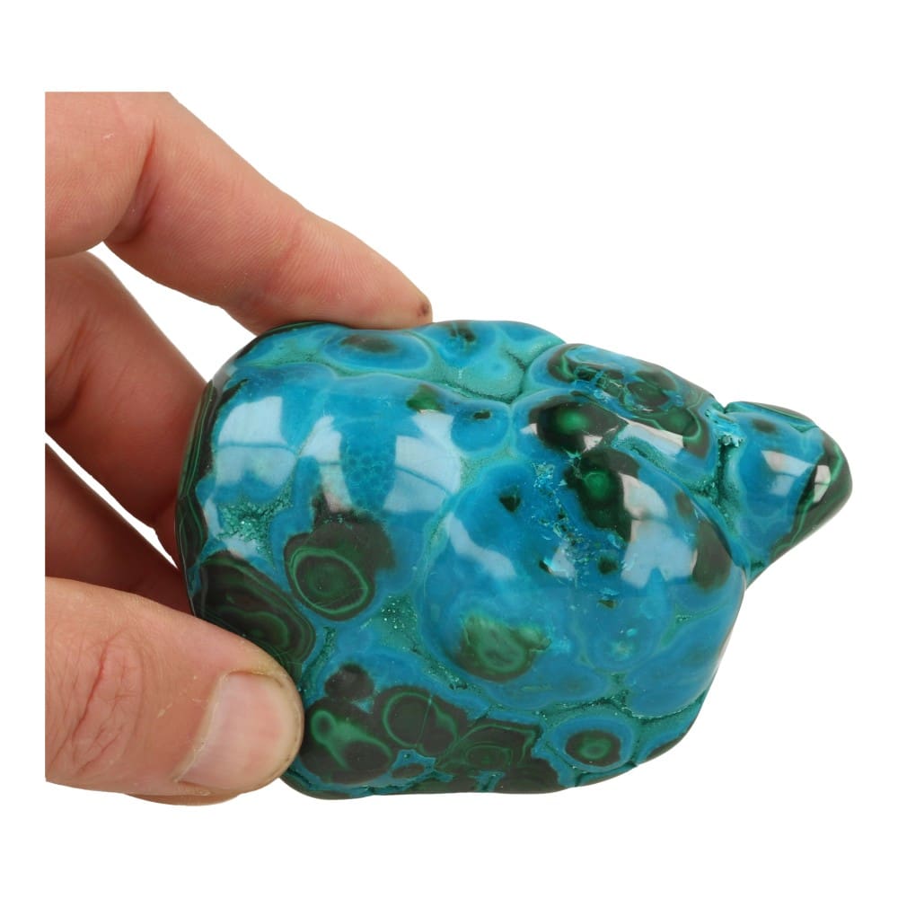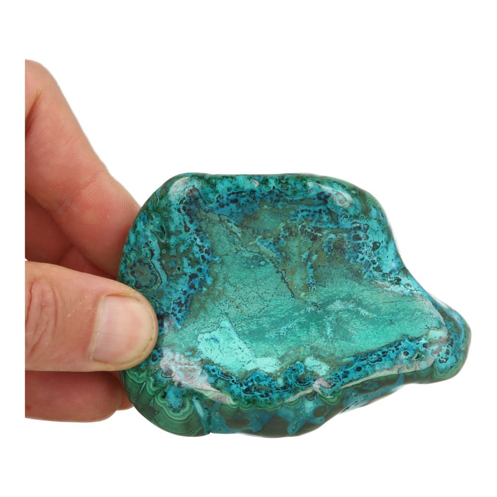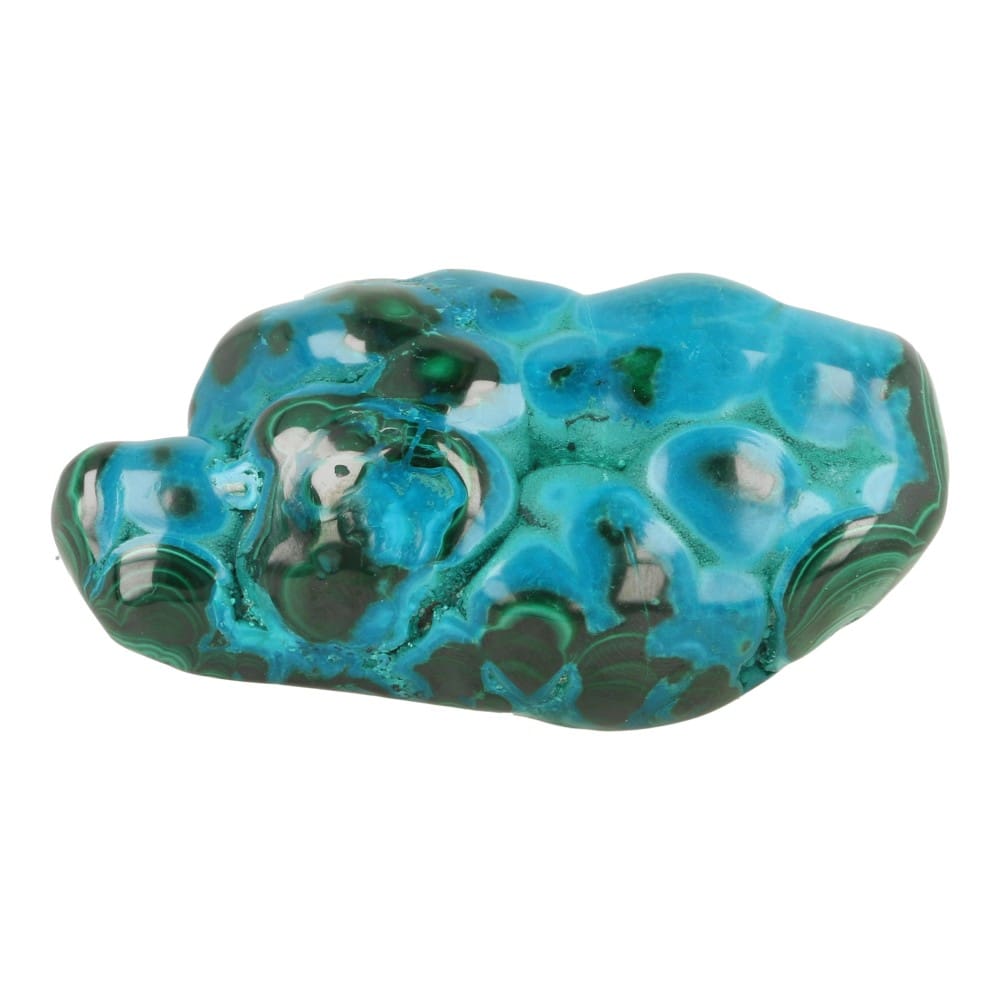 Prachtige chrysocolla met malachiet gepolijst met een afmeting van ca 89 x 64 x 30mm. Chrysocolla met malachiet wordt ook wel ‘malacolla’ genoemd. Deze malacolla heeft een spectaculaire kleur en textuur, puur natuur! Je ontvangt de chrysocolla van de foto. De boven- en onderzijde zijn chrysocolla, met daar tussen fraaie malachiet structuren. Een uniek stuk, een lust voor het oog!