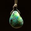 Je ontvangt de chrysocolla hanger doorboord met zwart waxkoord, maar je kunt het ook meer als sieraad dragen aan een zilveren ketting.