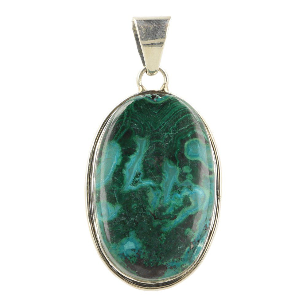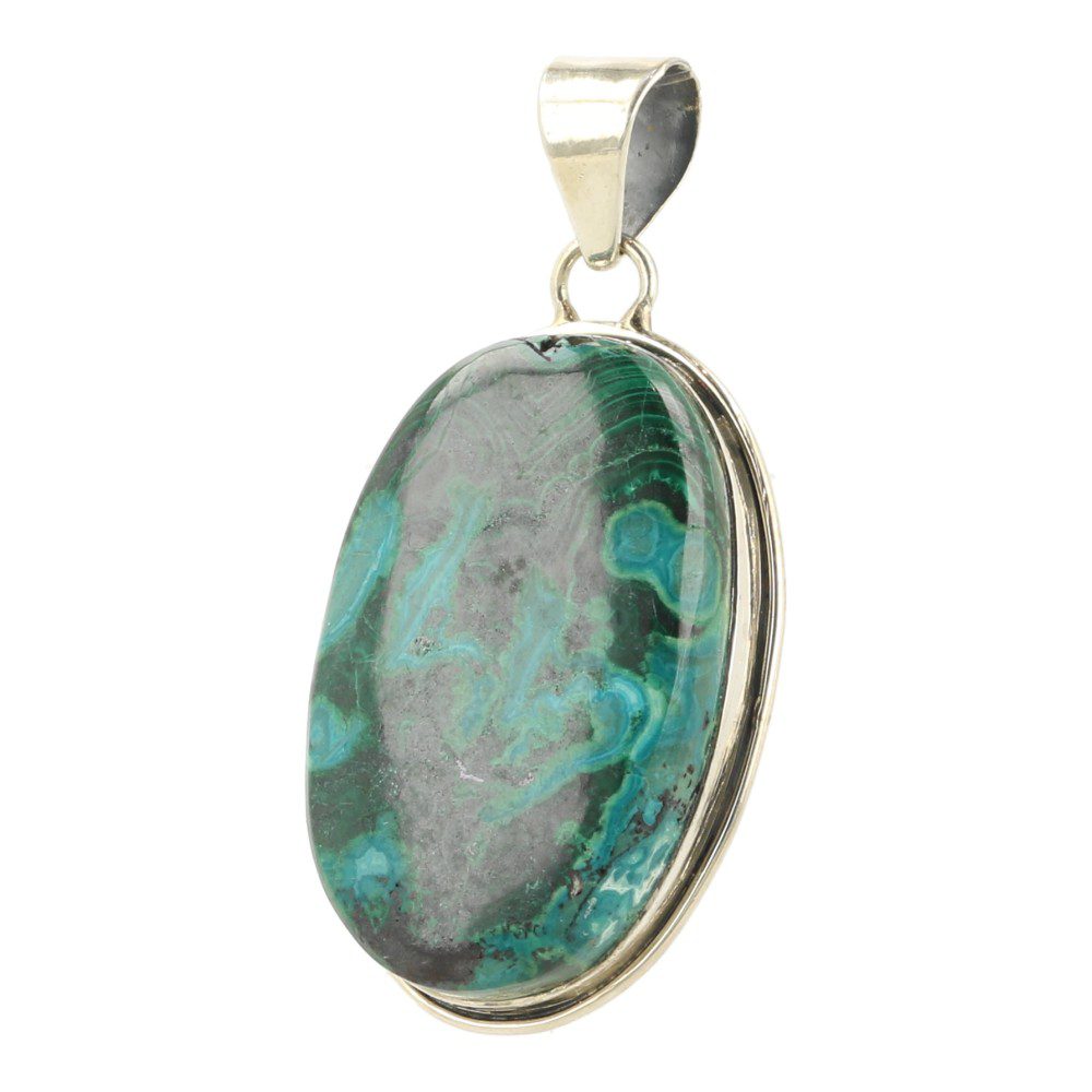 Prachtige chrysocolla met malachiet (malacolla) hanger in zilver van juwelierskwaliteit (925 sterling). Met een fraaie chrysocolla van 34mm hoog en 21mm breed. Je ontvangt de hanger van de foto.
