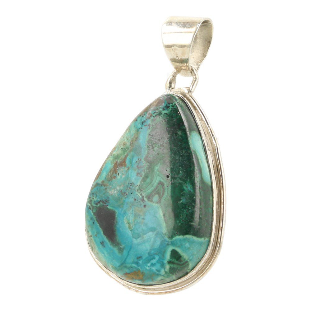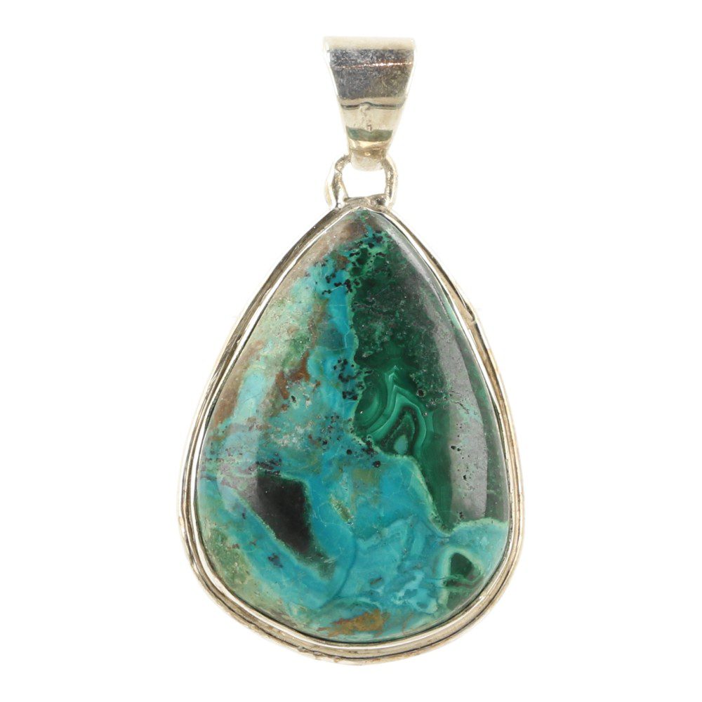Prachtige chrysocolla hanger in zilver van juwelierskwaliteit (925 sterling). Met een fraaie chrysocolla met malachiet van 33mm hoog en 23mm breed. Je ontvangt de hanger zona de foto.