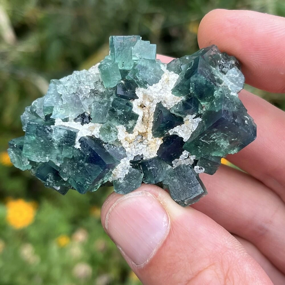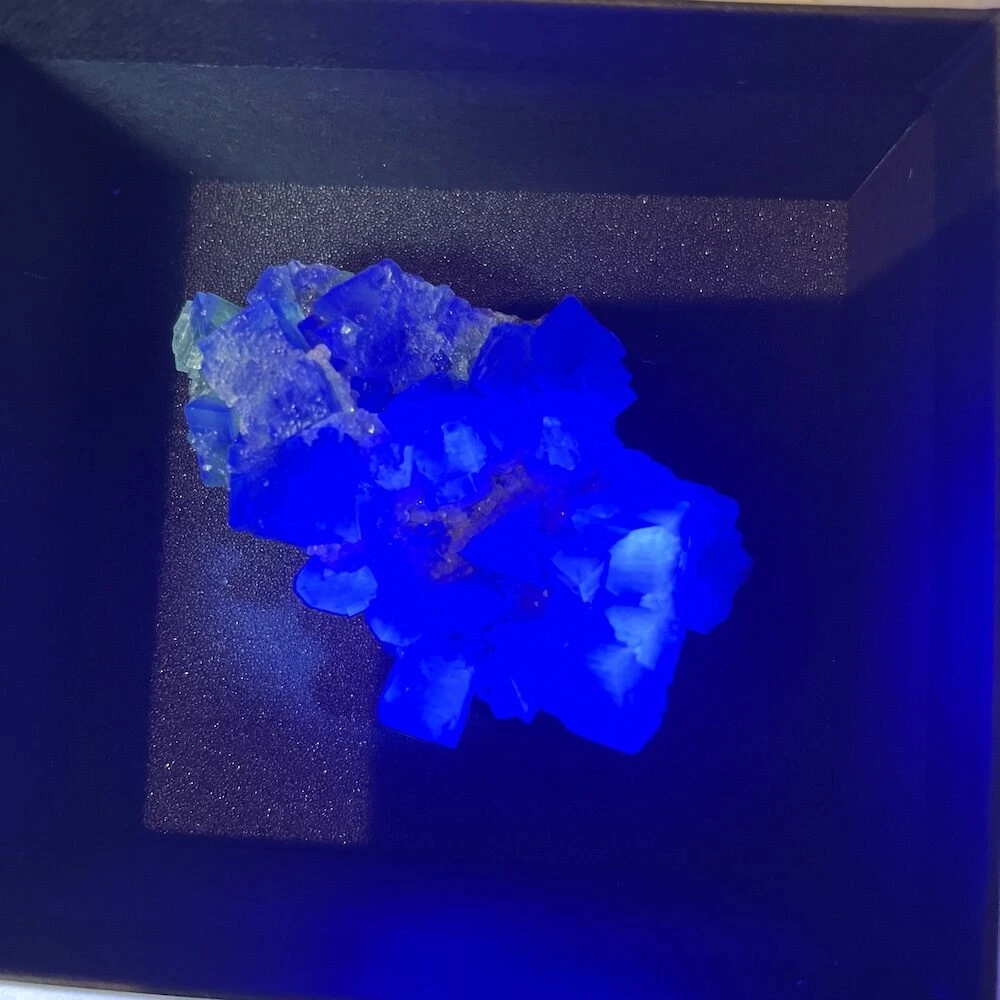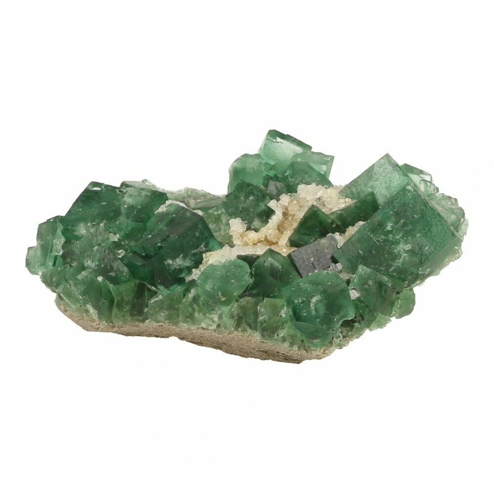Prachtige groene ruwe fluoriet kristallen op matrix uit Engeland. Naast de uitzonderlijke kwaliteit van de fluorietkristallen zijn deze daglucht actief. Dat betekent dat ze onder invloed van daglicht een blauwe gloed krijgen. En op UV-licht reageren ze helemaal spectaculair. Deze fluoriet komt uit de Druzy Dreams Pocket van de Rogerly Mine in Frosterley, Weardale. De afmeting van dit fraaie stuk is ongeveer 65 x 42mm en 23mm hoog. Over de fluoriet kristallen zijn gedeeltelijk kwartskristallen gevormd, kenmerkend voor deze pocket. Bijzonder en zeldzaam materiaal, direct van de mijn in Engeland. Je ontvangt het ruwe daglichtfluoriet cluster van de foto.