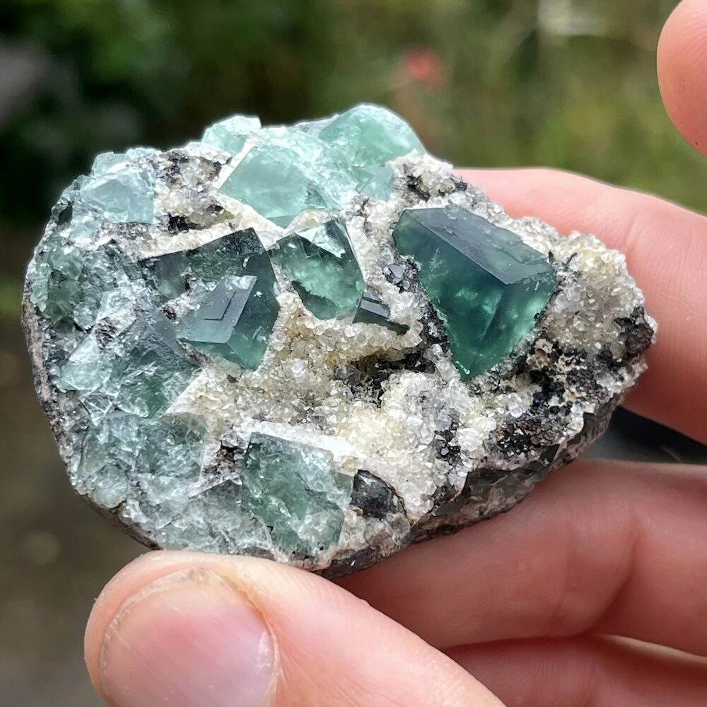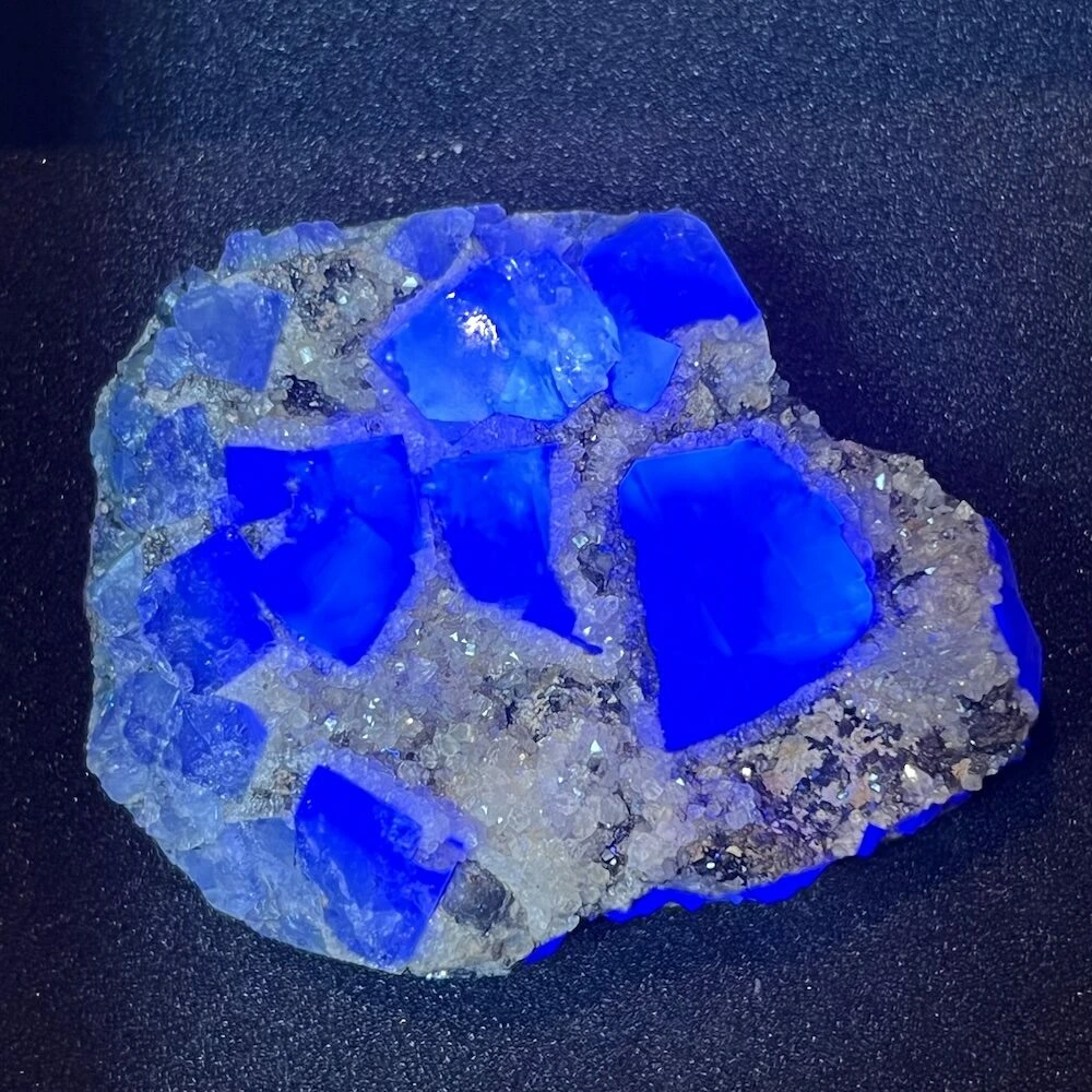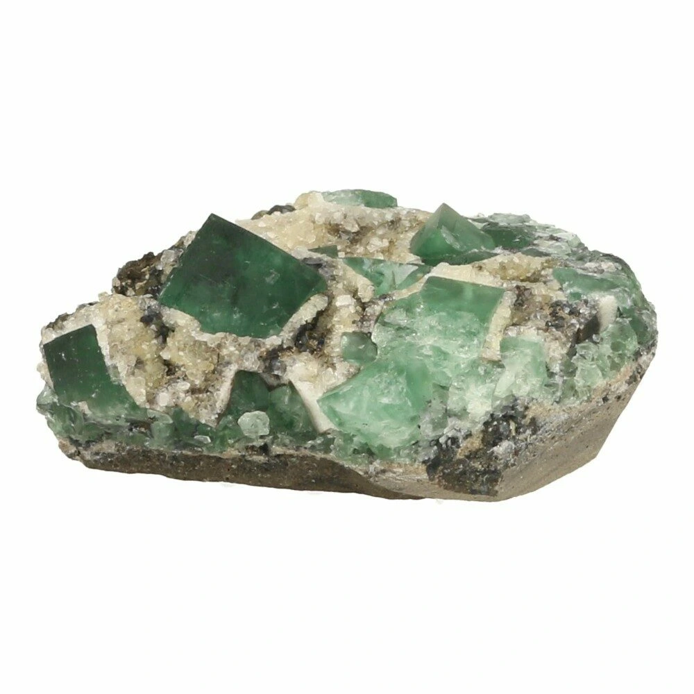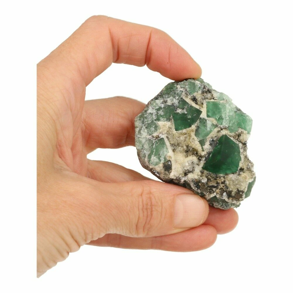 Prachtige groene ruwe fluoriet kristallen op matrix uit Engeland. Naast de uitzonderlijke kwaliteit van de fluorietkristallen zijn deze daglicht actief. Dat betekent dat ze onder invloed van daglicht een blauwe gloed krijgen. En op UV-licht reageren ze helemaal spectaculair. Deze fluoriet komt uit de Druzy Dreams Pocket van de Rogerly Mine in Frosterley, Weardale. De afmeting van dit fraaie stuk is ongeveer 58 x 47mm en 24mm hoog. Over de fluoriet kristallen zijn gedeeltelijk kwartskristallen en galeniet gevormd, kenmerkend voor deze pocket. Bijzonder en zeldzaam materiaal, direct van de mijn in Engeland. Je ontvangt het ruwe daglichtfluoriet cluster van de foto.