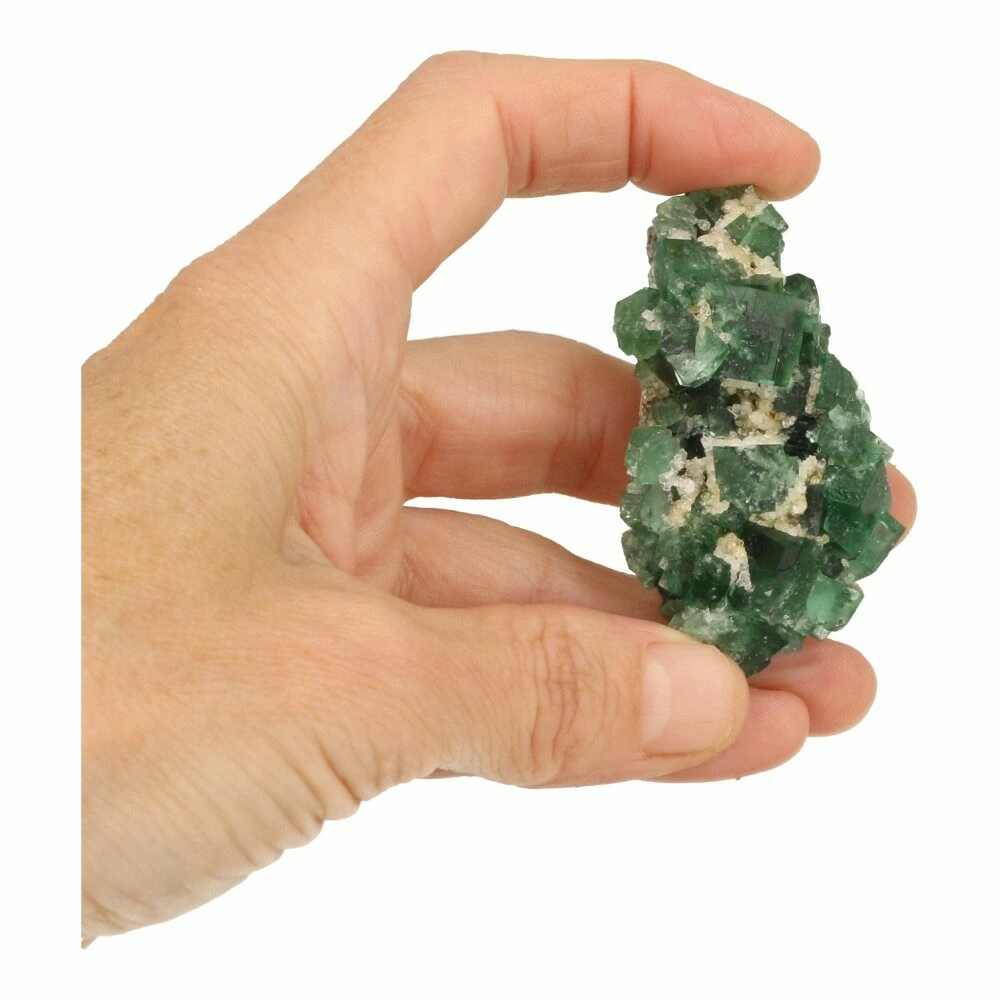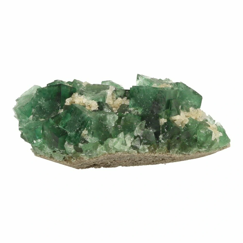 Prachtige groene ruwe fluoriet kristallen op matrix uit Engeland. Naast de uitzonderlijke kwaliteit van de fluorietkristallen zijn deze daglicht actief. Dat betekent dat ze onder invloed van daglicht een blauwe gloed krijgen. En op UV-licht reageren ze helemaal spectaculair. Deze fluoriet komt uit de Druzy Dreams Pocket van de Rogerly Mine in Frosterley, Weardale. De afmeting van dit fraaie stuk is ongeveer 63 x 35mm en 24mm hoog. Over de fluoriet kristallen zijn gedeeltelijk kwartskristallen gevormd, kenmerkend voor deze pocket. Bijzonder en zeldzaam materiaal, direct van de mijn in Engeland. Je ontvangt het ruwe daglichtfluoriet cluster van de foto.