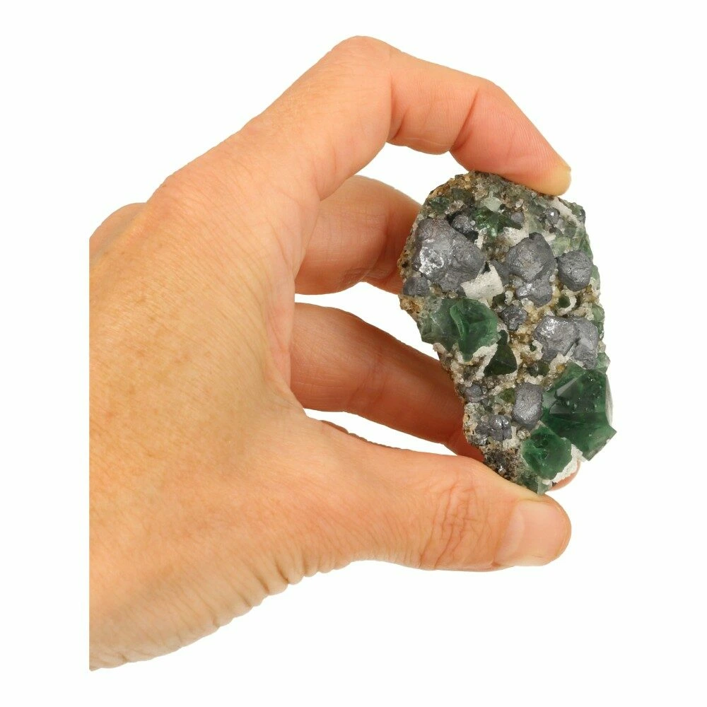 Prachtige groene ruwe fluoriet kristallen op matrix uit Engeland. Naast de uitzonderlijke kwaliteit van de fluorietkristallen zijn deze daglicht actief. Dat betekent dat ze onder invloed van daglicht een blauwe gloed krijgen. En op UV-licht reageren ze helemaal spectaculair. Deze fluoriet komt uit de Druzy Dreams Pocket van de Rogerly Mine in Frosterley, Weardale. De afmeting van dit fraaie stuk is ongeveer 63 x 42mm en 26mm hoog. Over de fluoriet kristallen zijn gedeeltelijk kwartskristallen en galeniet gevormd, kenmerkend voor deze pocket. Bijzonder en zeldzaam materiaal, direct van de mijn in Engeland. Je ontvangt het ruwe daglichtfluoriet cluster van de foto.
