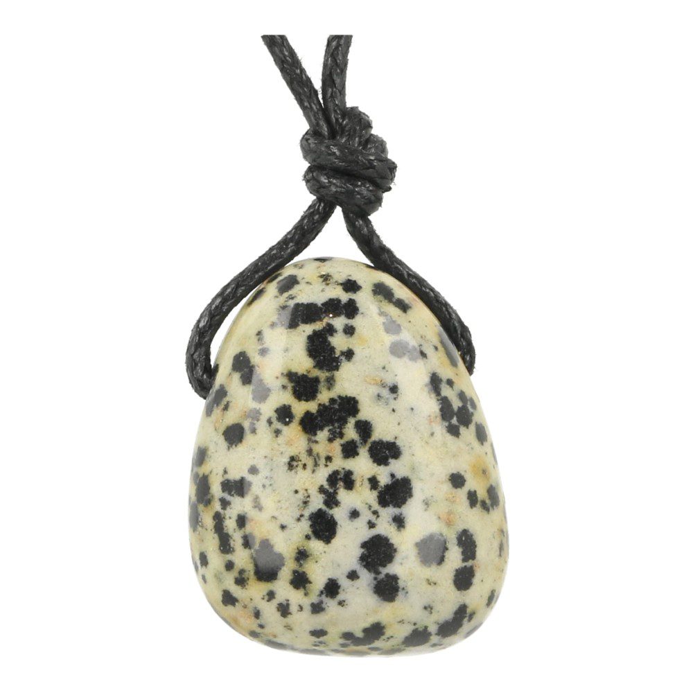 Fijne dalmatiër jaspis hanger doorboord aan zwart waxkoord. De afmeting van deze dalmatiër jaspis hanger doorboord is ongeveer 2cm breed en 3cm hoog. De tekening wisselt onderling, je ontvangt een soortgelijke dalmatierjaspis hanger met oogje als op de foto.
