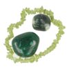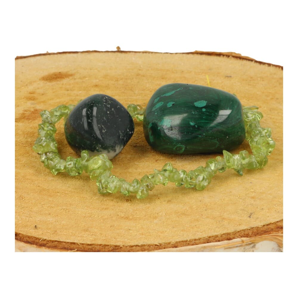 Leuke edelstenen set voor de bevalling. De set bestaat uit een peridoot armbandje, een mosagaat en een malachiet trommelsteen. Ieder van deze stenen heeft een werking op het geboorteproces. Je ontvangt een soortgelijke set als op de foto, in een leuk organza cadeauzakje met beschrijving.