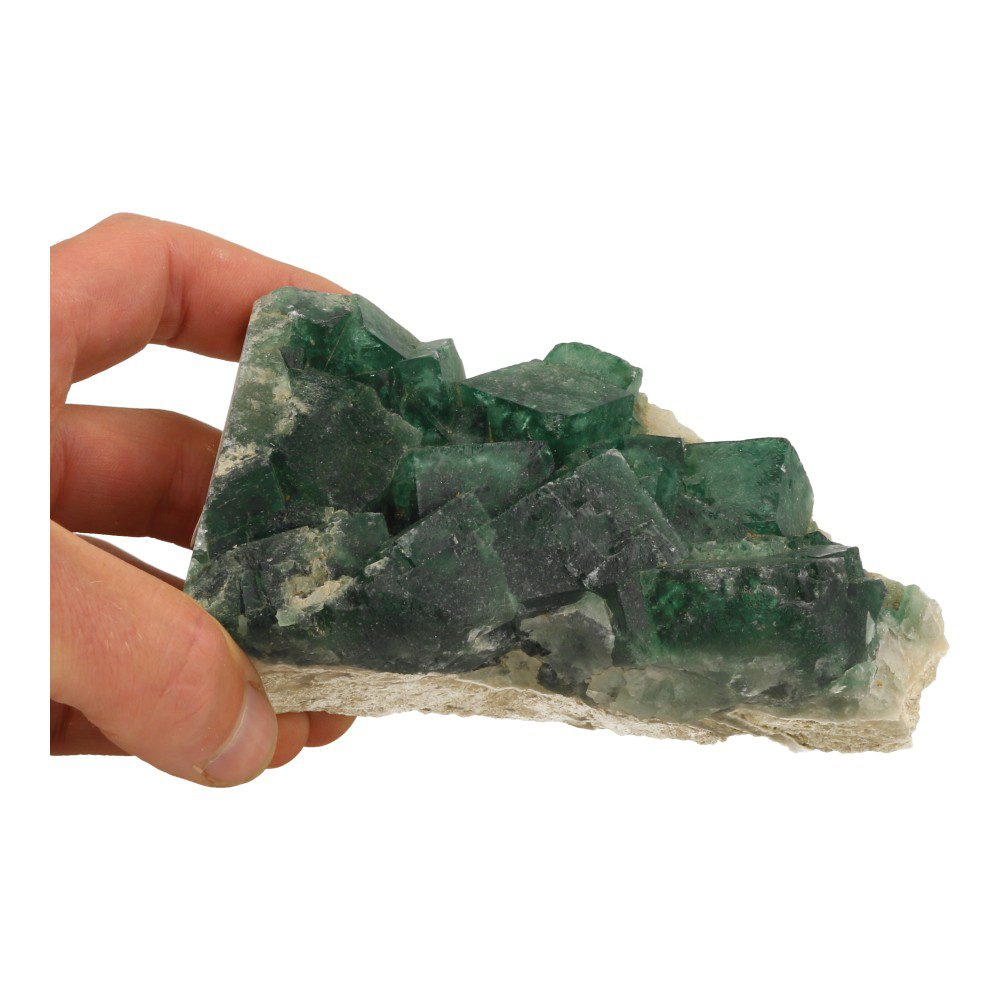 Prachtige groene ruwe fluoriet kristallen op matrix uit Madagaskar. Dit fraaie stuk kan zowel steen als liggen en heeft grote kubische fluoriet kristallen. De afmeting is ongeveer 13,5 x 7cm en 5cm dik. Je ontvangt het ruwe fluoriet cluster van de foto.