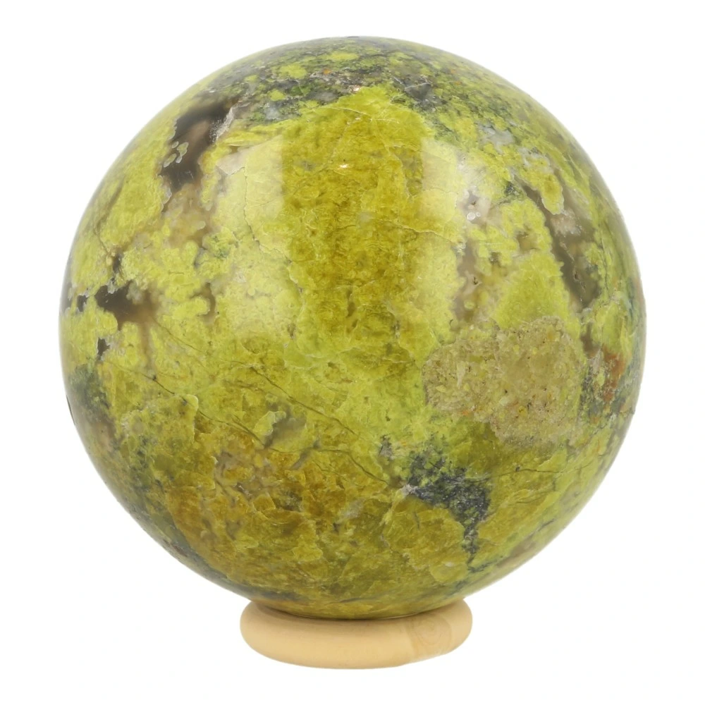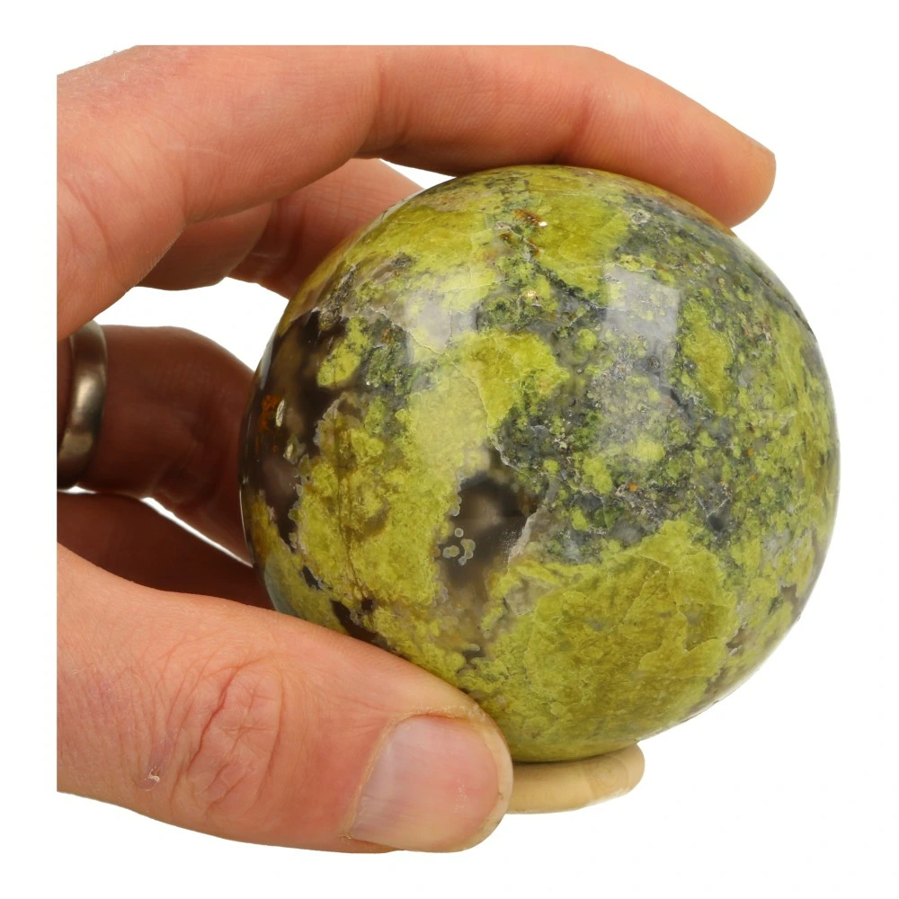 Mooi gemêleerde groene opaal bol met een diameter van 71mm op een houten ring. Je ontvangt de groene opaal bol van de foto.