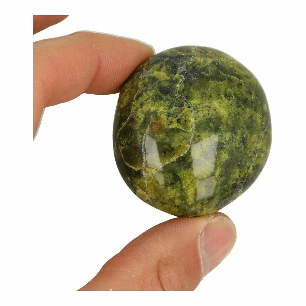 Mooi gemêleerde groene opaal knuffelsteen van 5-6cm lang en 2-3 cm dik. Je ontvangt een soortgelijke groene opaal knuffelsteen als op de foto.