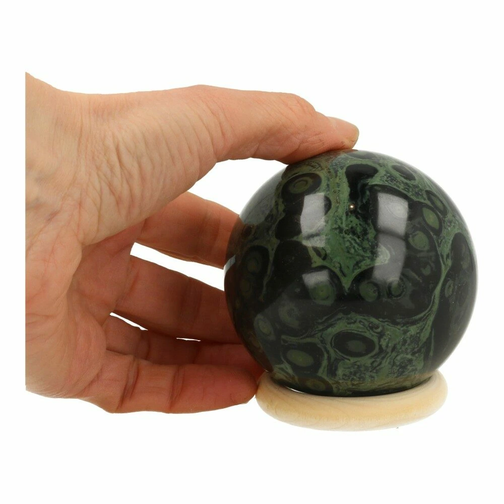 Fraai getekende kabamba jaspis bol van 75mm doorsnede. Je ontvangt de Kabamba jaspis bol van de foto, inclusief houten ringetje.