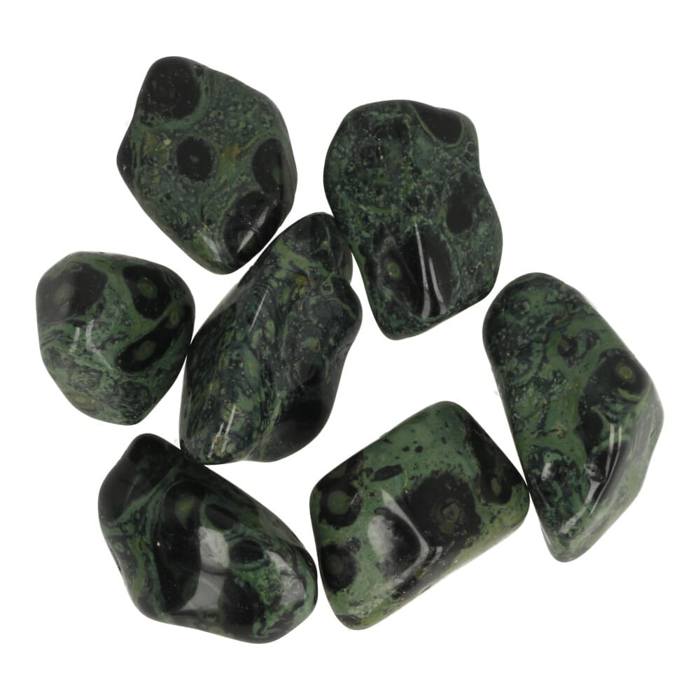Kambaba jaspis is een grijs-groene variant van jaspis en heeft donkere ‘ogen’ in de steen.