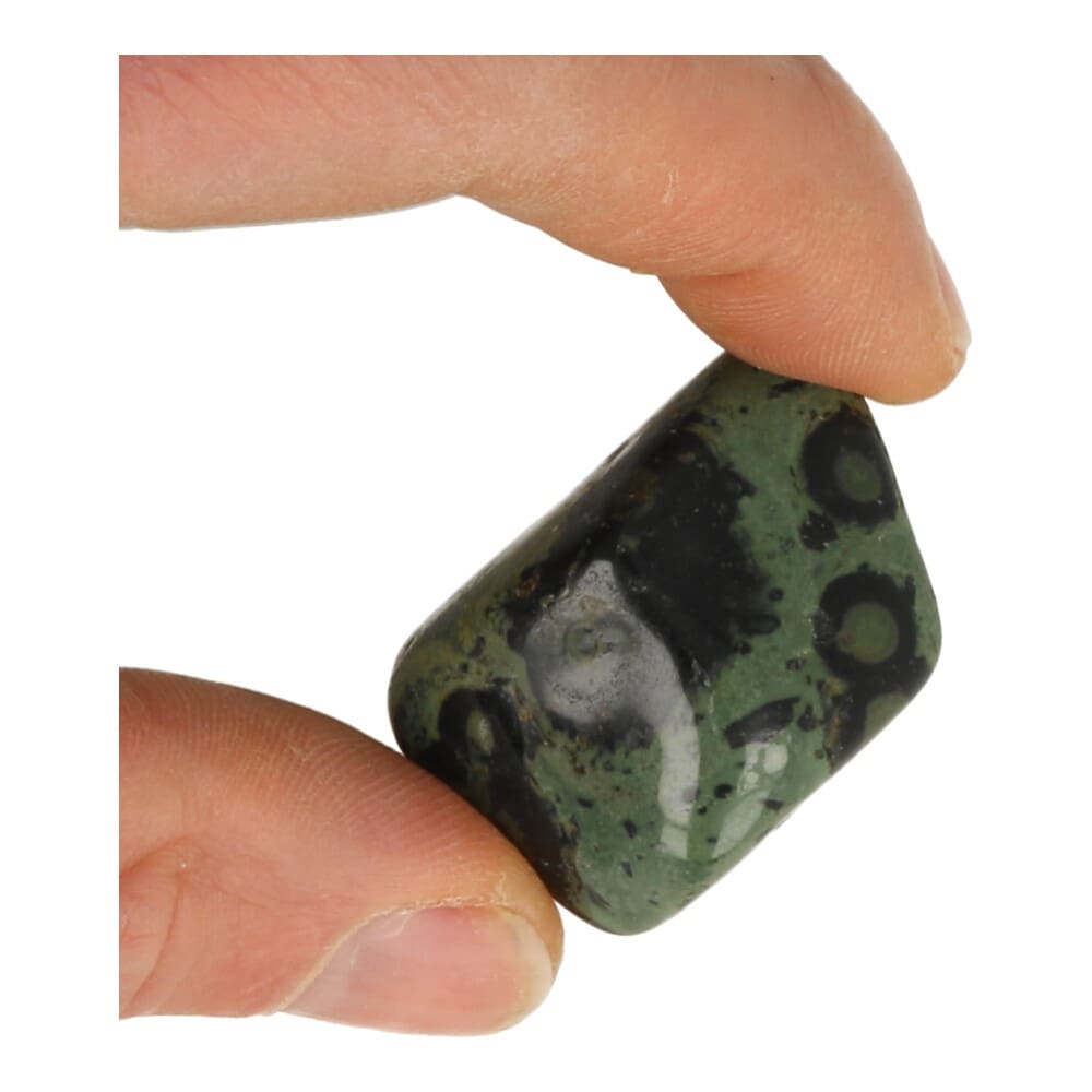 Mooie groene kabamba jaspis trommelsteen van 3-4 cm lang uit Madagaskar. Je ontvangt een soortgelijke kabamba jaspis trommelsteen als op de foto.