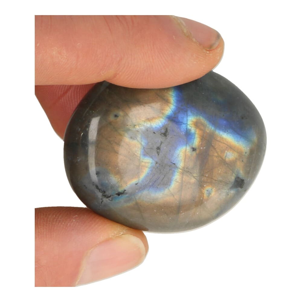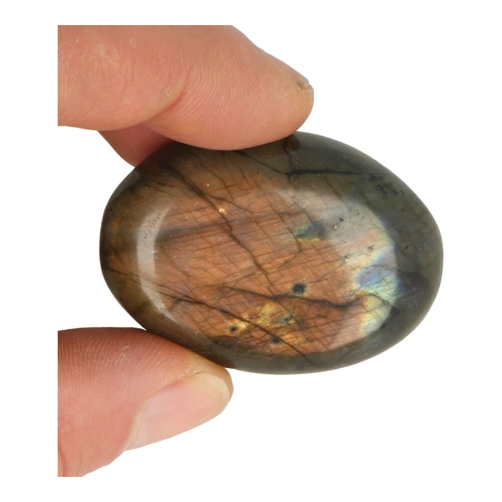 Mooi formaat labradoriet knuffelsteen met uitbundige flash, overwegend in goud-roze-oranje kleuren. Ze zijn allemaal anders en allemaal mooi. Je ontvangt een soortgelijke labradoriet knuffelsteen als de foto.