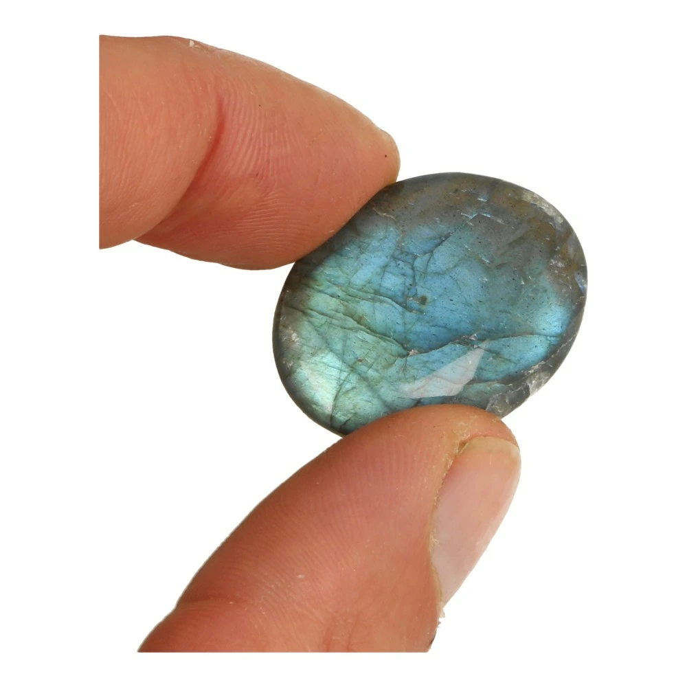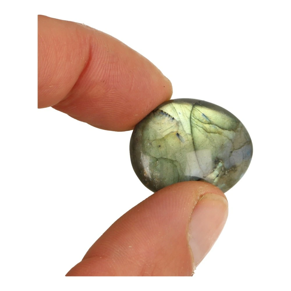 Fraaie, handgeslepen labradoriet labradoriet trommelsteen plat met glimmende blauwe en gele vlakken. Je ontvangt een soortgelijke labradoriet trommelsteen als op de foto. Iedere steen heeft een mooie ‘flash’. Wil je een labradoriet bij je dragen? Kijk dan ook eens bij de labradoriet hangers. De afmeting van deze labradoriet trommelsteen plat is ongeveer 3-3,5 cm lang, 2-2,5cm breed en 1cm dik.