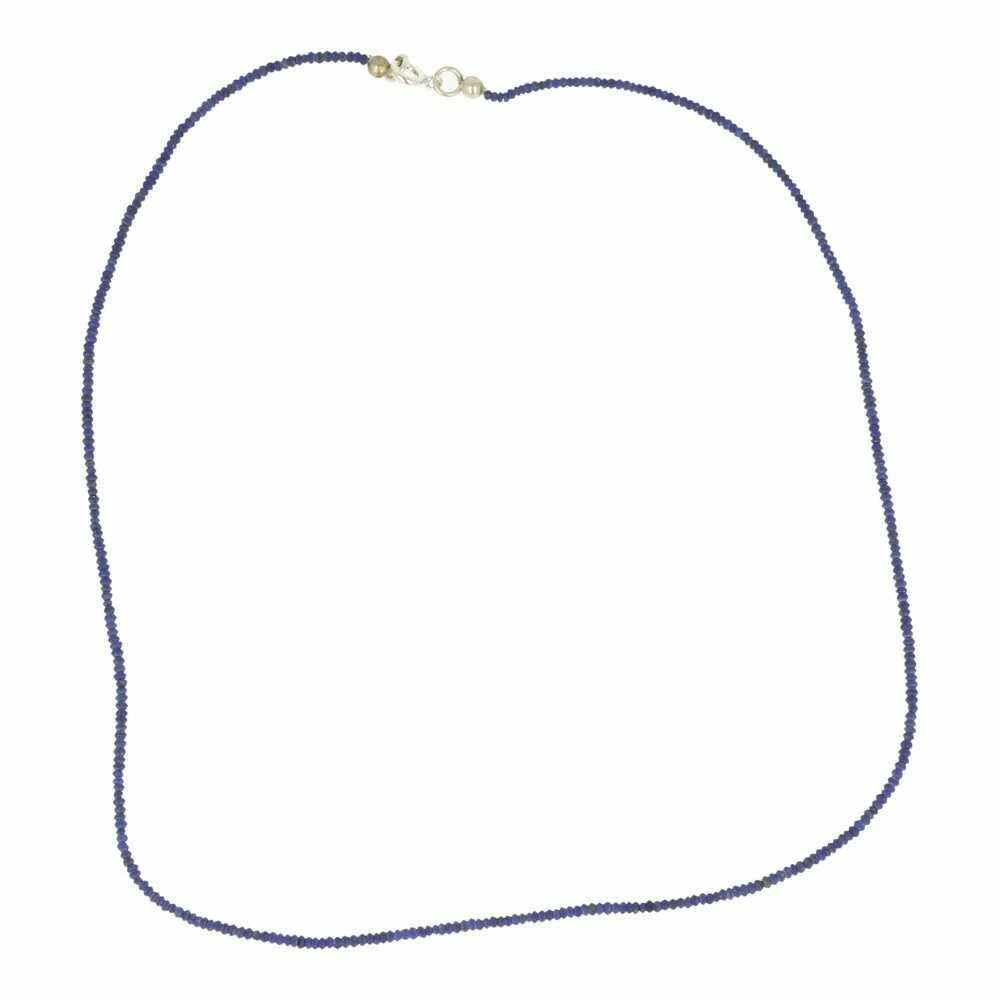 Fraaie diepblauwe lapis lazuli ketting met kralen van 2mm breed en een lengte van 45cm. De sluiting van deze lapis lazuli ketting is van zilver. De kralen zijn cilindervormig met een afmeting van ongeveer 2mm diameter en 1mm hoog. Topkwaliteit lapis lazuli, waarbij alle kleine reststukjes zijn gebruikt voor de ketting. Je ontvangt een soortgelijke lapis lazuli ketting als op de foto, de kwaliteit is zeer gelijkwaardig.