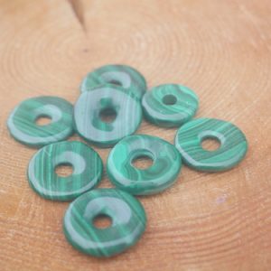 Mooie diepgroen geaderde malachiet donuts van ongeveer 1,5-2cm diameter. Dit kleine formaat donut kan je bij je dragen, maar kan ook aan een ketting worden gedragen. Je ontvangt een soortgelijke malachiet donut als op de foto.