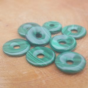 Mooie diepgroen geaderde malachiet donuts van ongeveer 1,5 – 2cm diameter. Dit kleine formaat donut kan je bij je dragen, maar kan ook aan een ketting worden gedragen. Je ontvangt een soortgelijke malachiet donut als op de foto.