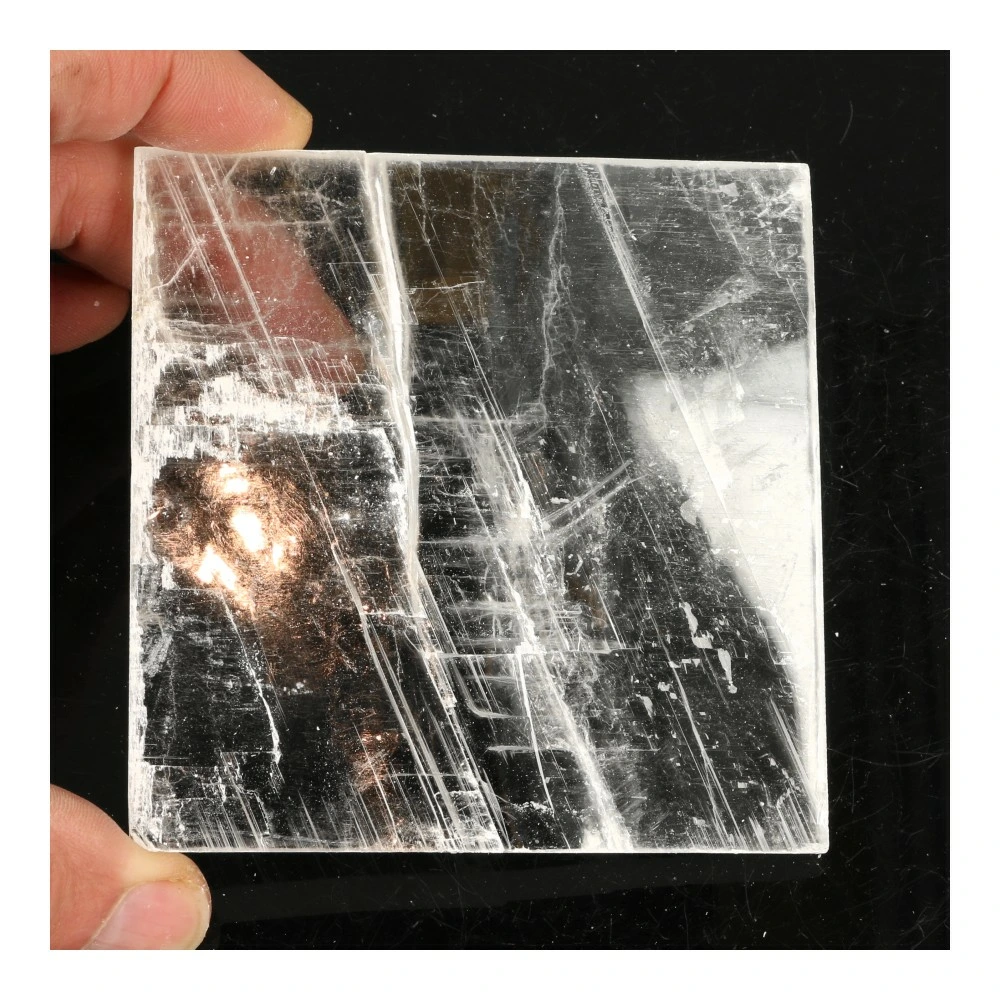 Fraai helder mariaglas oplaadplaatje van 10 x 10cm en circa 6mm dik uit Mexico. Je kunt dit seleniet oplaadplaatje gebruiken om kleinere stenen en sieraden energetisch te zuiveren en weer lekker fris te maken van energie. Je ontvangt een soortgelijke mariaglas oplaad plaat als op de foto.