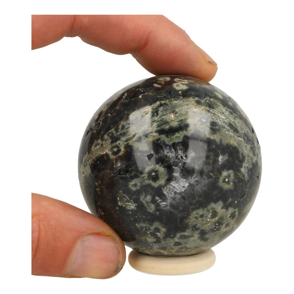 Bijzondere groene oceaanjaspis bol met een diameter van 6cm uit Madagaskar. Je ontvangt de oceaan jaspis bol van de foto inclusief houten ringetje. Oceaanjaspis wordt ook wel ogenjaspis genoemd vanwege de stippen. Deze bol heeft een fraaie kleur en een aantal natuurlijke holtes. Uniek!