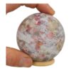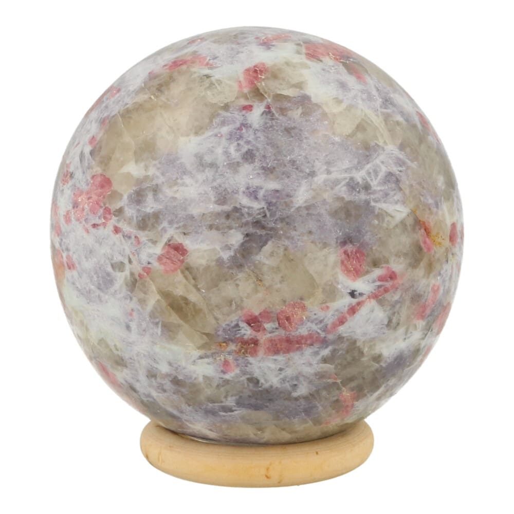 Fraaie bol van paarse lepidoliet met roze toermalijn in kwarts, ook wel pegmatiet genoemd. Deze bijzondere nieuwe vondst in 2020 komt van Madagaskar. De pegmatiet bol heeft een diameter van 69mm. Je ontvangt de pegmatiet bol van de foto met een houten ringetje. Bijzonder aan deze bol is helder roze toermalijn, prachtig in de witte ondergrond.