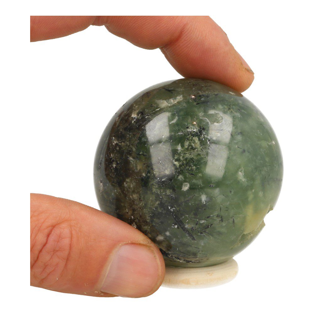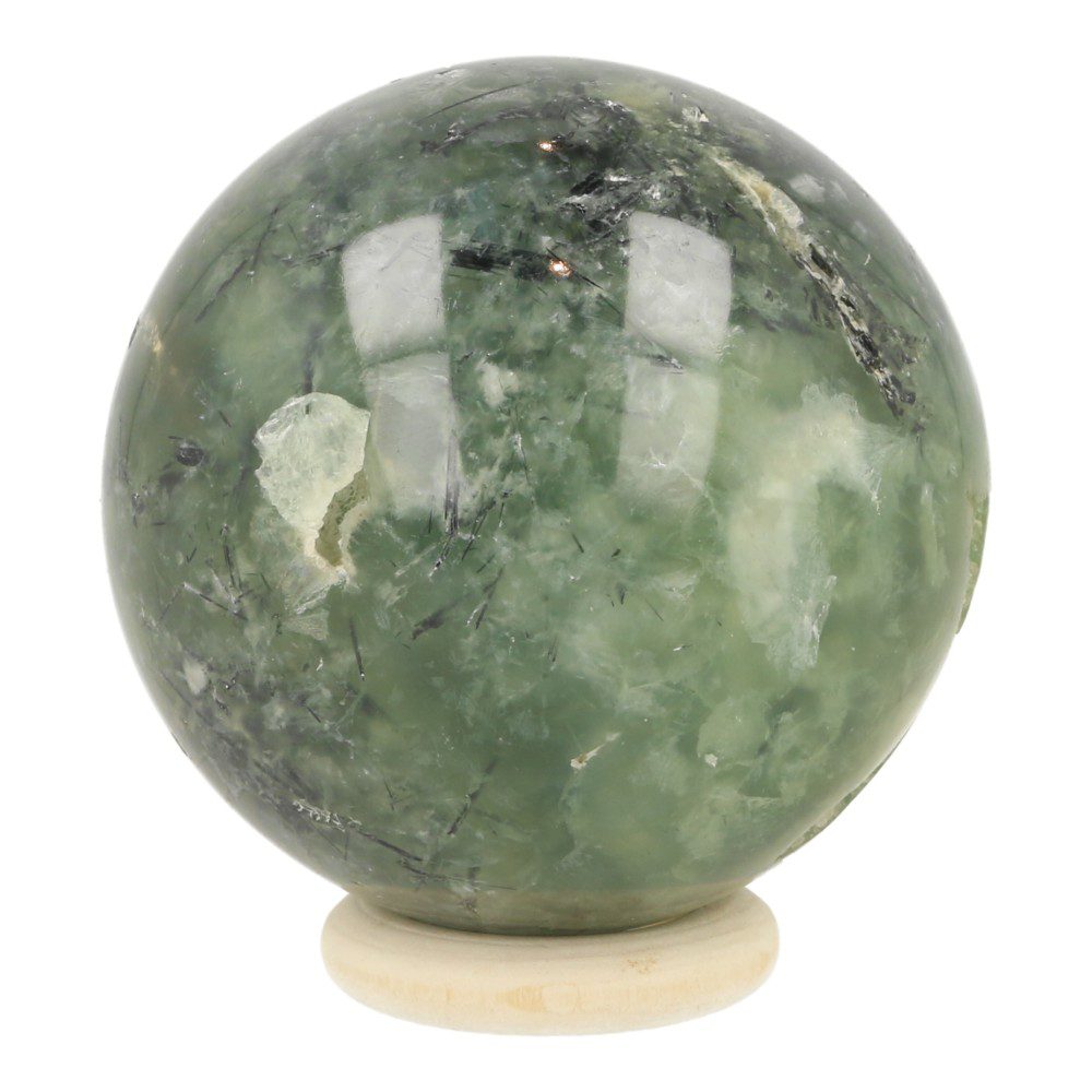 Mooie helder groene prehniet bol uit India met een diameter van 55mm op houten ringetje. Deze prehniet bol heeft een aantal natuurlijke holtes en zit vol met epidoot naaldjes. Uniek en zeldzame bol. Je ontvangt de bol van de foto.