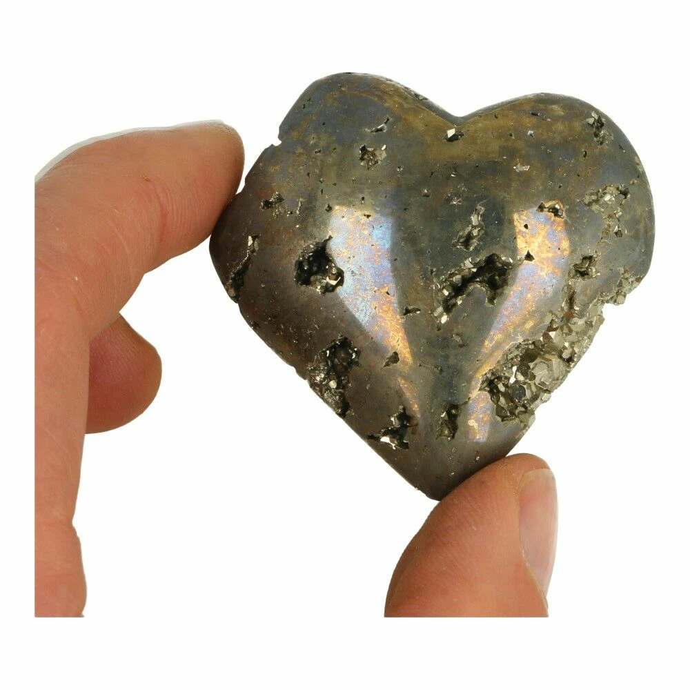 Mooi formaat pyriet hart uit Peru. De afmeting van dit pyriet hart is 55mm breed, 51mm hoog en 25mm dik. Dit pyriet hart heeft een fraaie glans en holtes met pyriet kristallen. Je ontvangt het hart van de foto.