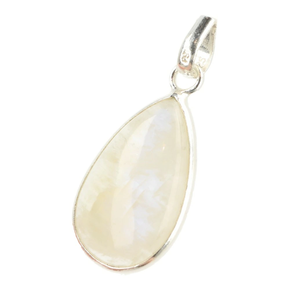 Mooie helder transparante witte maansteen hanger in zilver ‘MS4’. Onder de juiste hoek heeft iedere hanger de kenmerkende blauwe gloed van witte maansteen. Deze fraaie hanger is licht doorschijnend en heeft een subtiele witte kleur. De blauwe flash is heel subtiel, net zoals de energie van deze hanger. Heel zacht en vrouwelijk.
